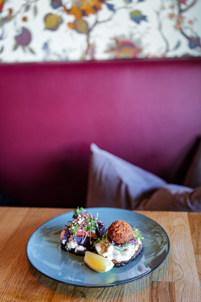 Jeg gikk for to smørrebrød. Det ene med fritert røkt torsk med sitron og skagenrøre av håndpillede reker fra Lyngen (165 kr) og nummer to med bakte beter, røkt ferskost, estragonolje, puffet bokhvete og revet pepperrot.