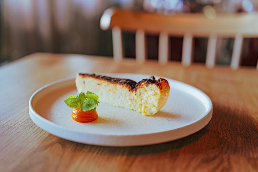 Jeg klarer ikke å dy meg når jeg ser Burnt basque cheescake med tindved (125 kr) på menyen. Er det en ting jeg elsker så er det den baskiske ostekaken. Jeg er bare lei av å se den på annenhver meny for jeg elsker originalen fra La Viña i San Sebastian.