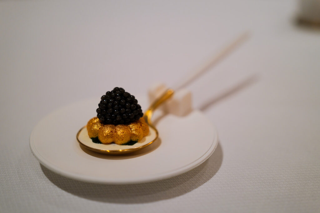 Prolog, som første akt kalles i Speilsalens smaksmeny «Stor Symfoni» starter med en tolkning av egg og kaviar, men selvsagt på Speilsalen-måten. På skjeen ligger crème fraîche tilsatt fermentert purreløksjuice toppet med en myk omelett laget med egg fra Galåvolden gård, pyntet med gull og osietracaviar fra GastroUnika. Det er vel unødvendig å si at dette smakte ufattelig godt og luksuriøst. Ganske langt unna Kavli kaviar på kokt egg.