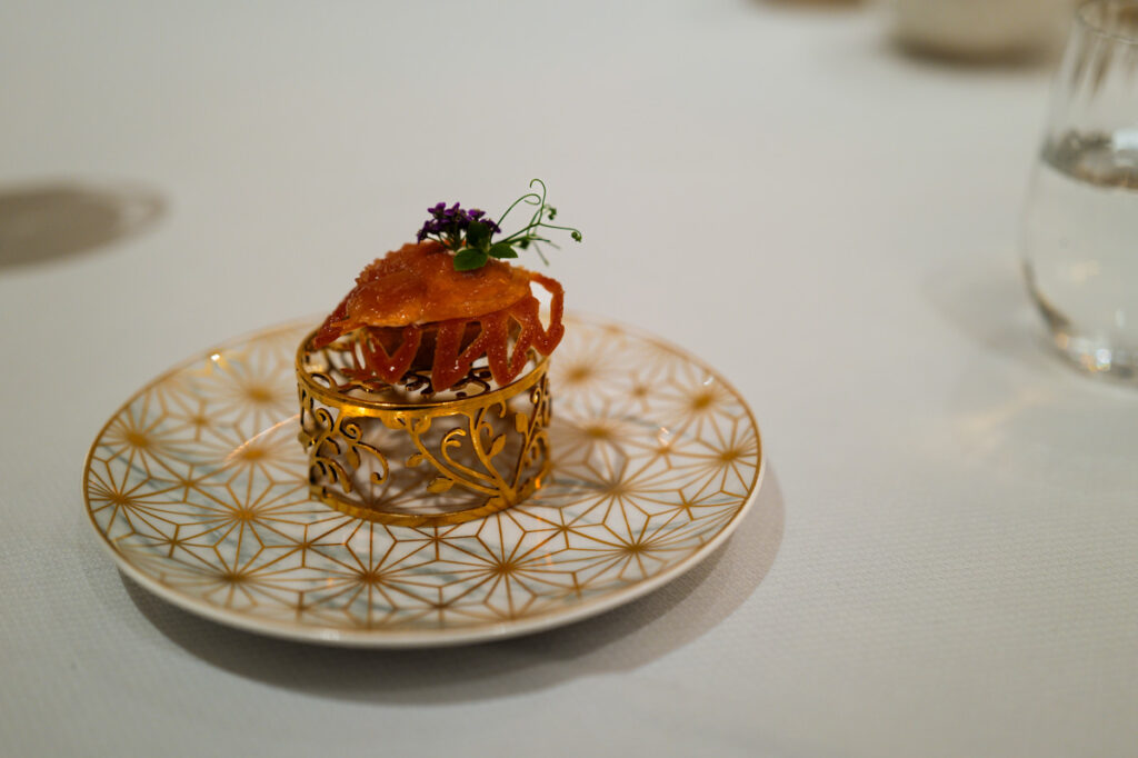 Snack nummer to ligger på en gullfarget pidestall. Den lille terten er et kreativt kunstverk i seg selv. Den lille krabben på pidestallen understreker at dette er kongen av krabbe, nemlig kongekrabben.