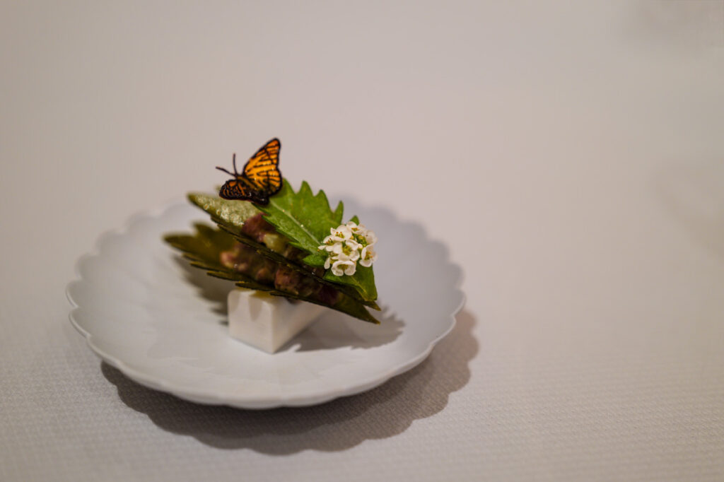Neste rett er noe av det vakreste jeg har sett. Små løvtynne blader laget av spinat og løpstikke med en tartar av lam fra Hitra der dyrene bor på holmer og spiser tang, urter og alt som kan gi kjøttet karakter. Tartaren er blandet med løpstikke og osten «rød ku» og purreløk. På toppen en liten sommerfugl. For en smaksbombe!