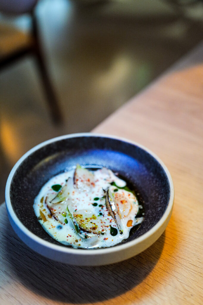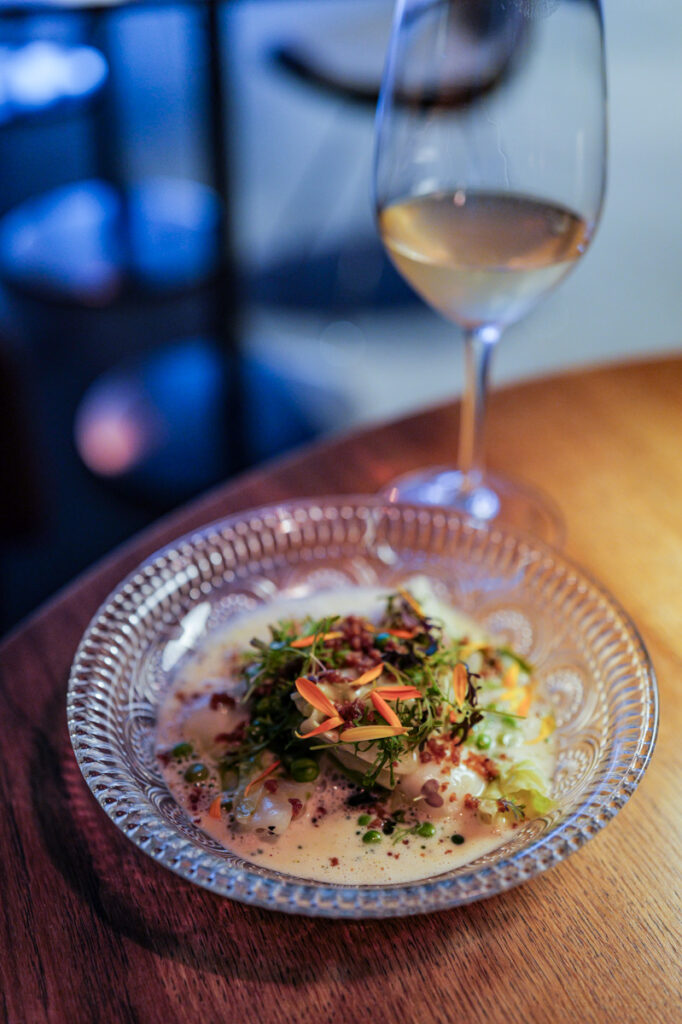 Den mest geniale retten var allikevel (nok) en tilnærmet vegetarrett (vel, nesten da) som jeg hadde byttet mot kjøtt any time. Grillet sellerispyd med guanciale, lardo, gremulatamajones, surdeigsperler og skvallerkål minner meg om Nomas legendariske sellerishawarma, men Eskilds variant var moderne, lett og definitivt i toppklassen.