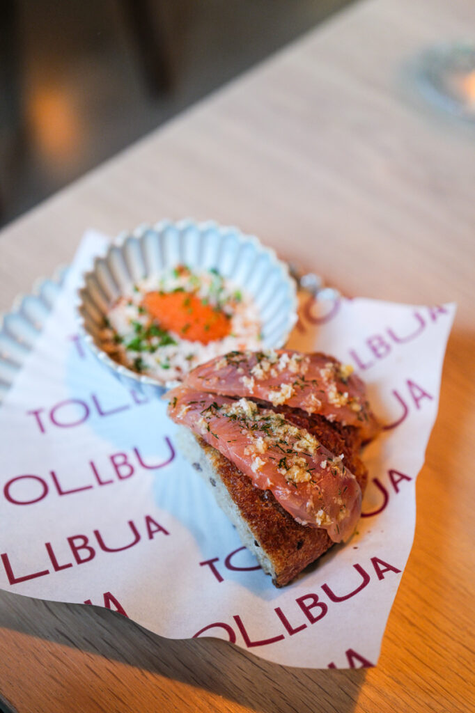 Bollen, eller bolinhos minner om portugisiske klippfiskboller, men her laget med røkt torsk. Den har perfekt konsistens og smak. Dette smørrebrødet er også en kreativ variant av et dansk “stjerneskudd”, men gjort med lokale råvarer.