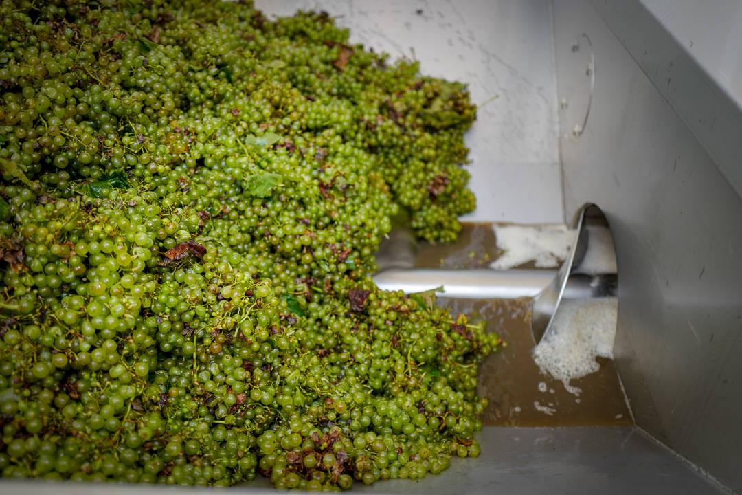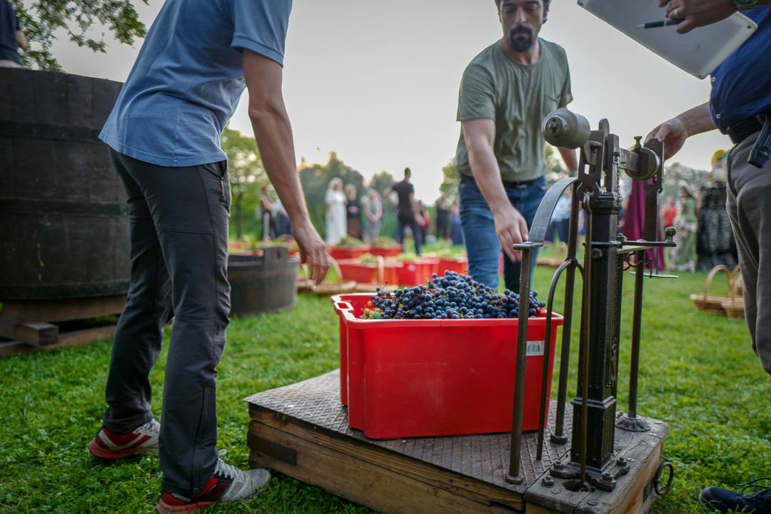 Kassene med druer veies nøysomt opp av en tallmann med blyant bak øret. Muskuløse herremenn velter druene over i store tønner.