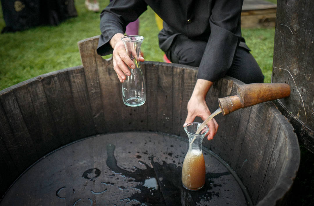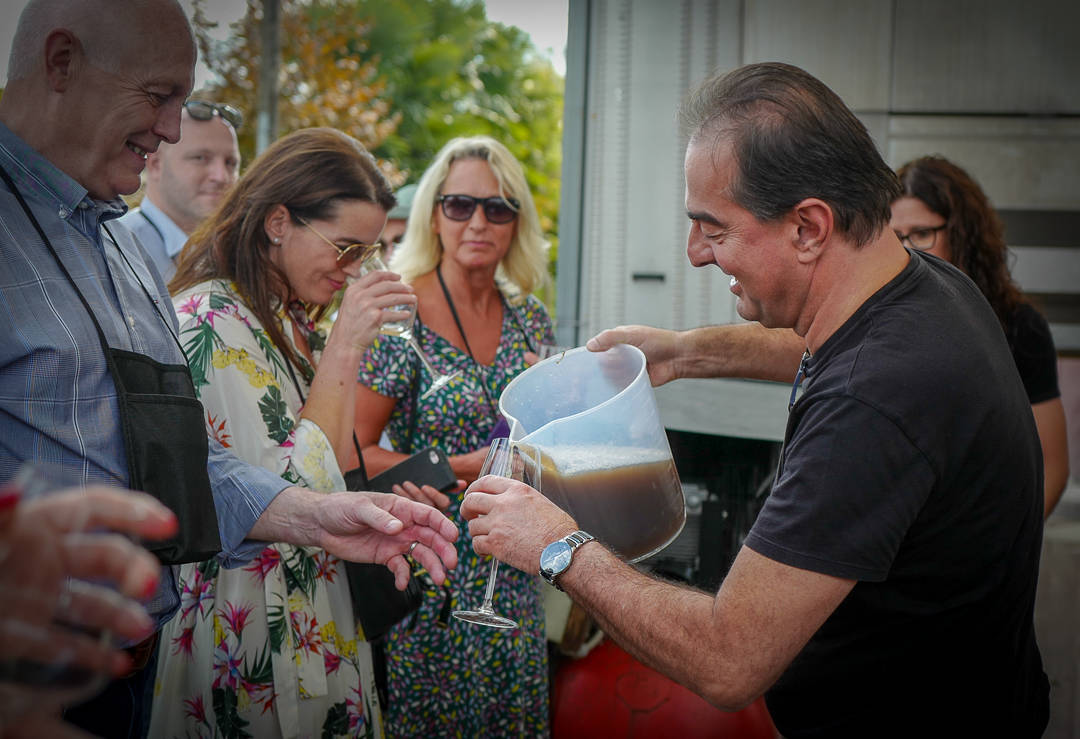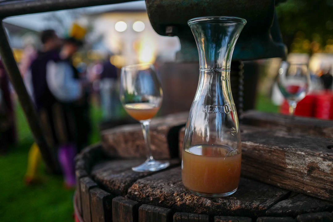 Sandro tapper nypresset juice og skjenker til gjestene. Vi skal alle smake på den før vi får ferdig prosecco.