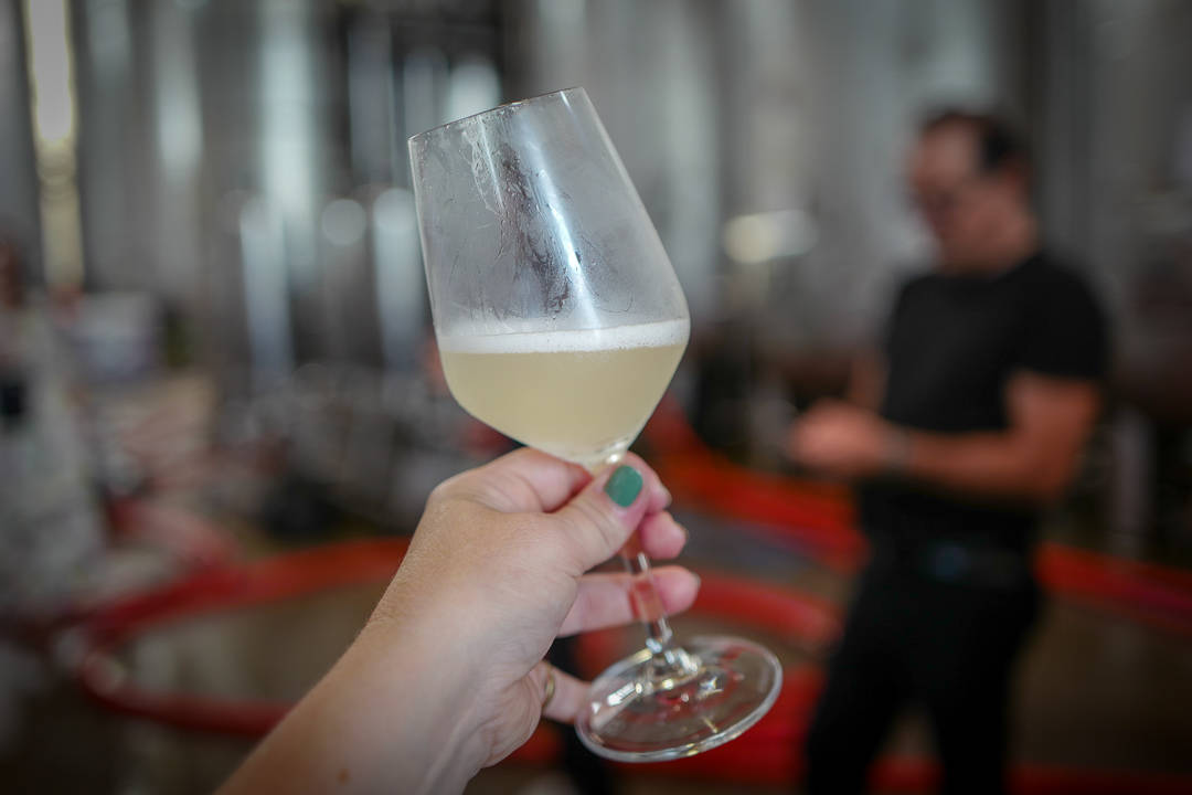 Vi smaker den nypressede druesaften. Vi smaker faktisk også druesaft som er på gjæringsstadiet.