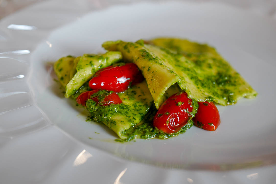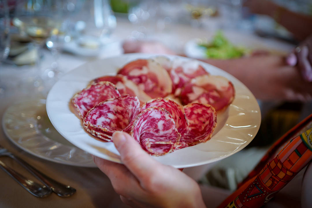 Vi spiser lunsj. Sandro skjenker egenprodusert olivenolje over salaten og blander den ved bordet. Han serverer og skjenker. Han skåler og underholder gjestene.