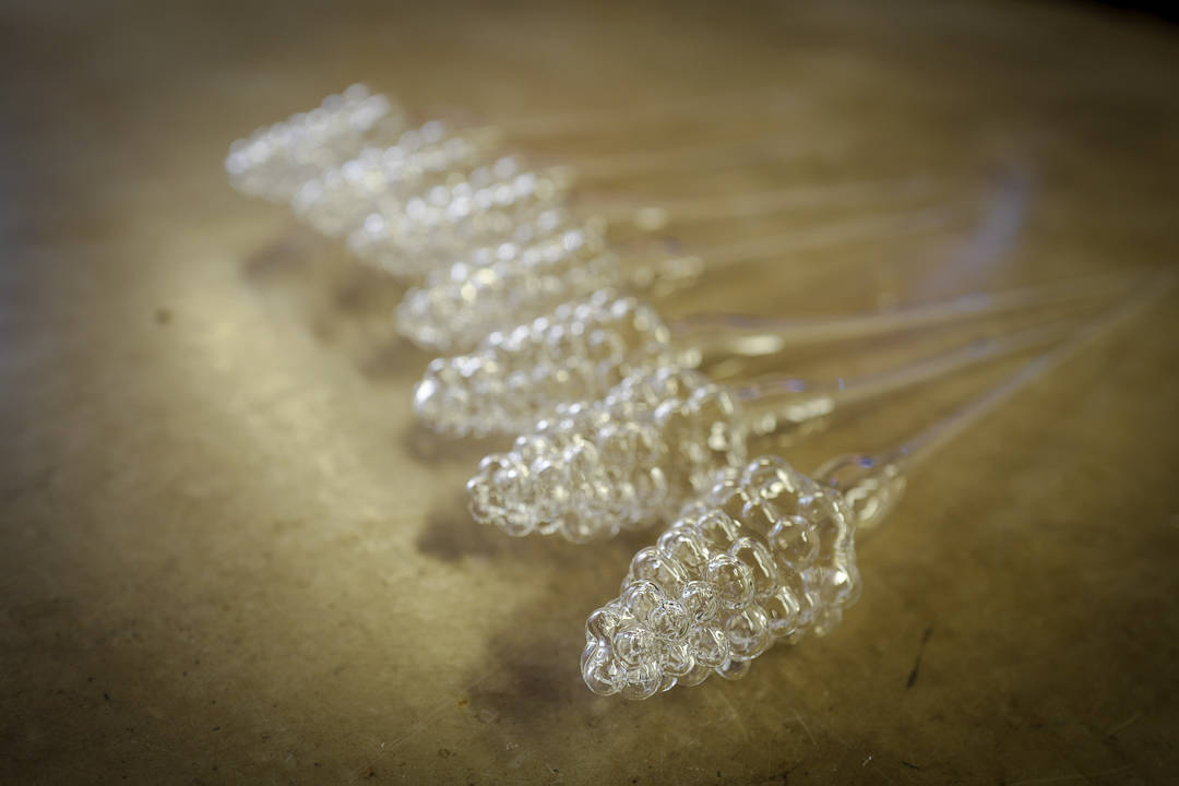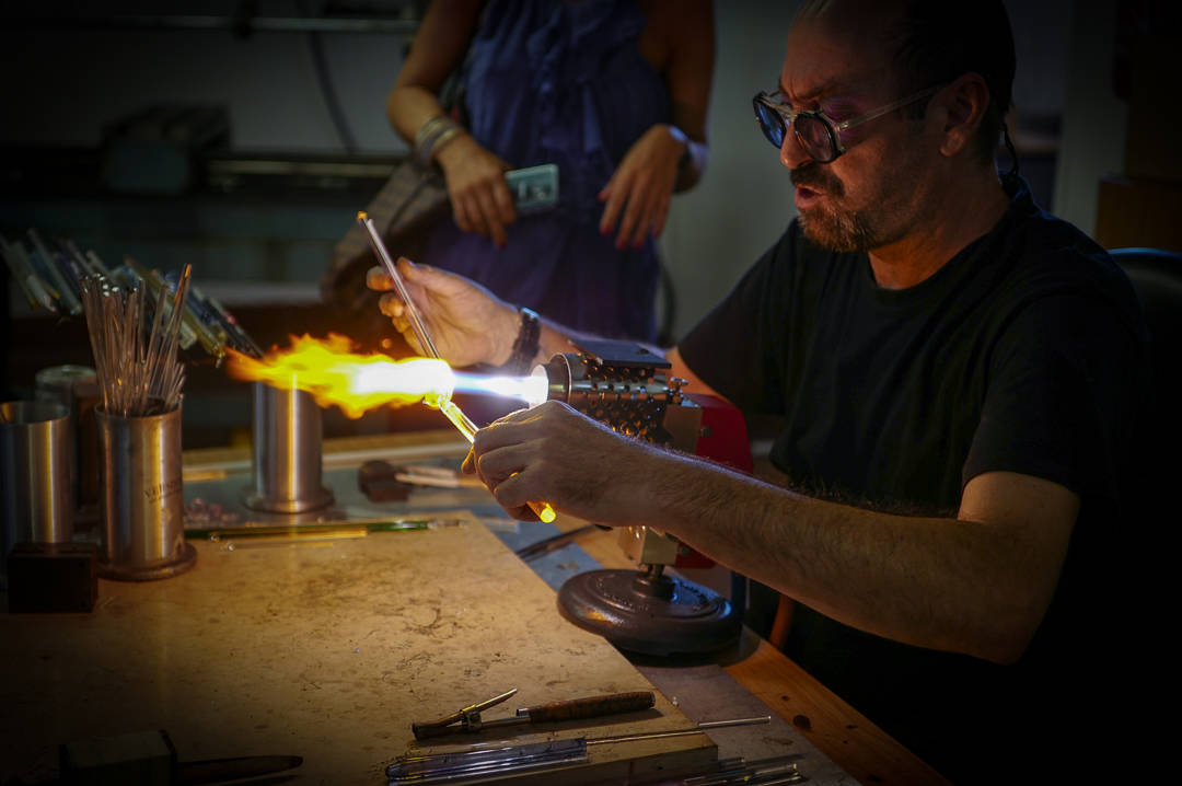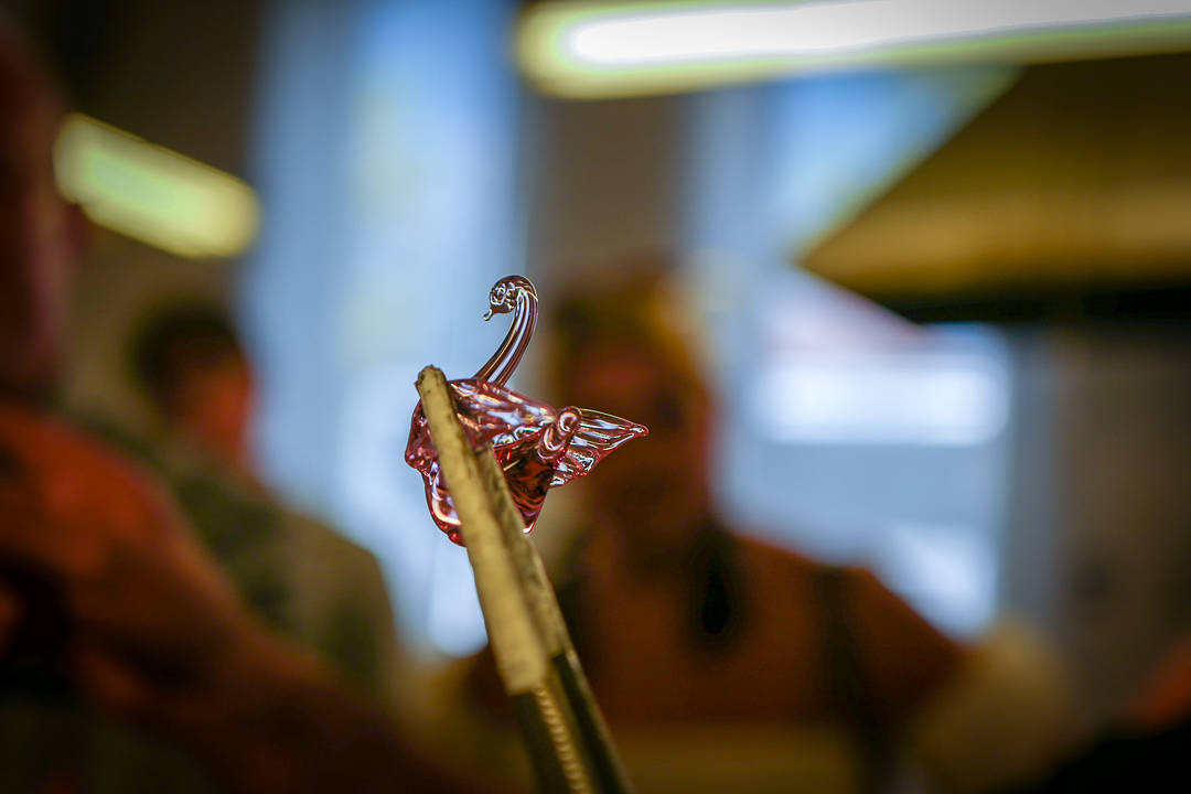 Vi reiser ut til glassfabrikken der de håndlagde glassfigurene blåses av kvalifiserte glasskunstnere. Ut av flammen kommer perfekte svaner som skal settes inne i små glassflasker som skal fylles med grappa.