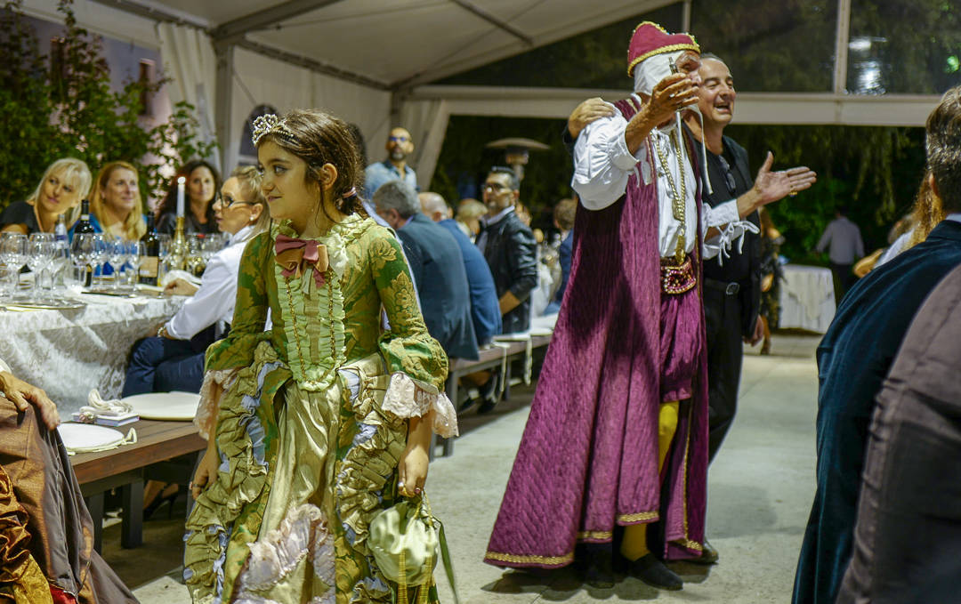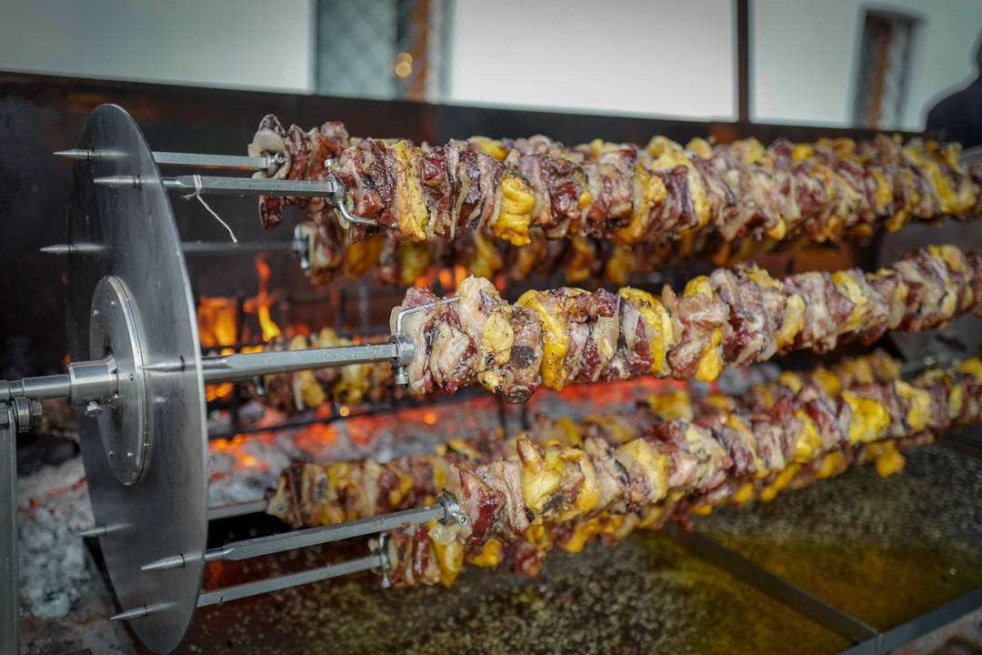 Det er langbord og rett på rett bæres ut. Ute på gårdsplassen har to karer passet store rotisserispyd med svin og kylling. De er nå klarer til å fraktes inn til bordet. Servitørene bærer de enorme spydene som om de skulle være matadorer på en spansk tyrefekterarena. Etter seiersgangen serveres kjøttet.