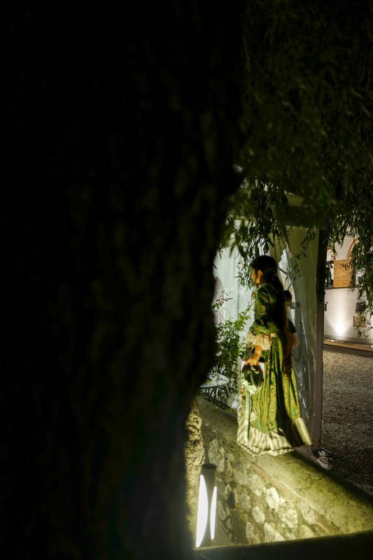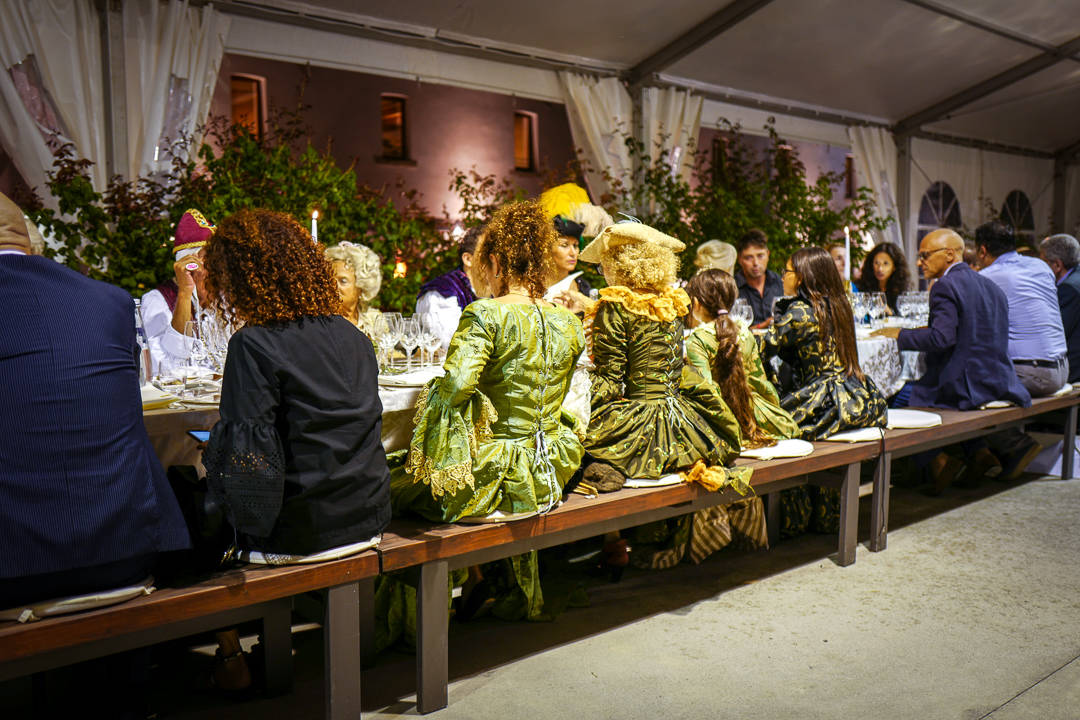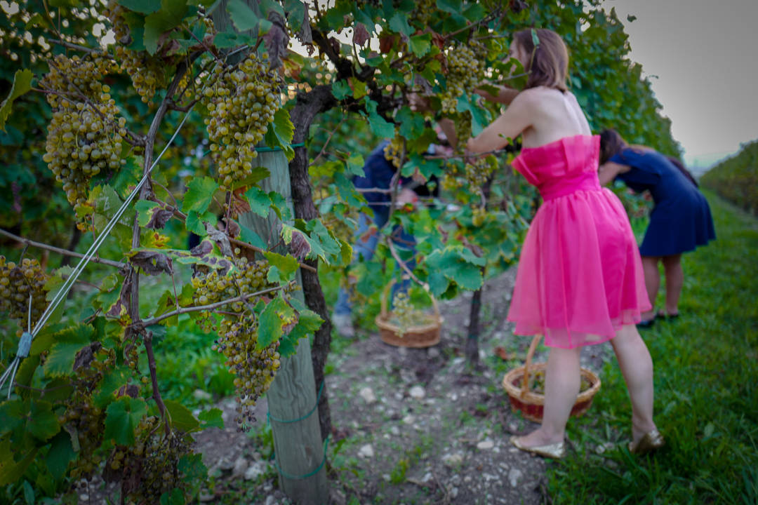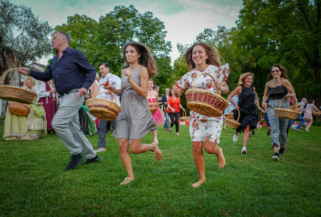 Man må jobbe for føden og gjestene deles inn i lag. I festkjoler og tyllskjørt løper festdeltakerene rundt med kurver og saks. Her skal det plukkes druer.