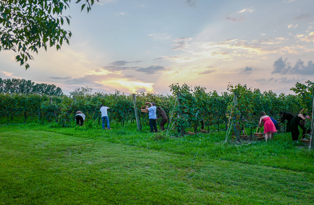 Vi blir plukket opp etter en liten stund og festkledde reiser vi i samlet flokk tilbake til vingården. Det er klart for Harvest Party.