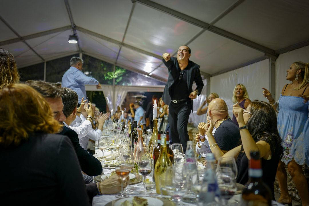 Coverbandet i den ene enden av selskapsteltet spiller den ene crowd pleaseren etter den andre og før tiramisuen er servert danser de aller fleste på bordene. Sandro Bottega viser ingen tegn på å gå tom for batterier. Han er en Duracell-kanin.