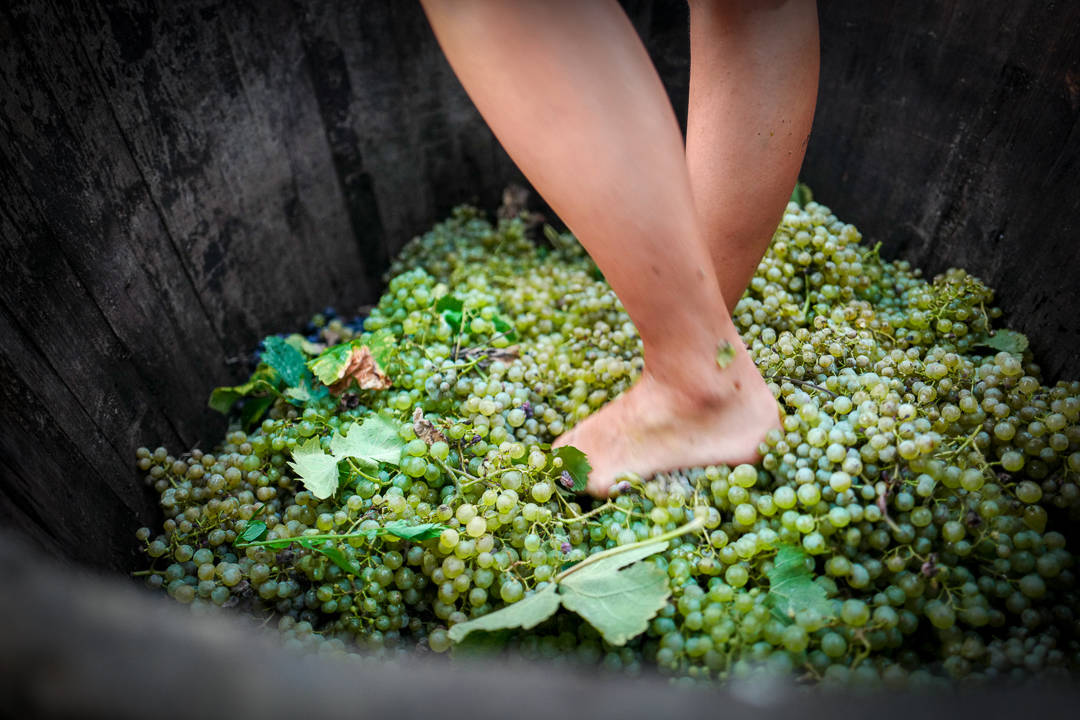 Kassene med druer veies nøysomt opp av en tallmann med blyant bak øret. Muskuløse herremenn velter druene over i store tønner.