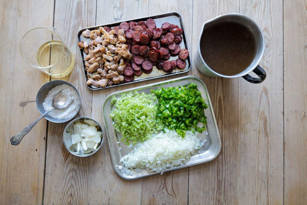 Vår gumbo inneholder roux, «The holy trinity» (lik mengde stangselleri, løk og paprika skåret i små terninger), hvitløk, litt cajun-krydder (du kan bruke litt kayennepepper), god kraft, andouille-pølse og kjøtt fra et stort kyllinglår. Vi brukte også beinet fra kyllinglåret (etter at jeg hadde renskåret det for kjøtt) til kraften.