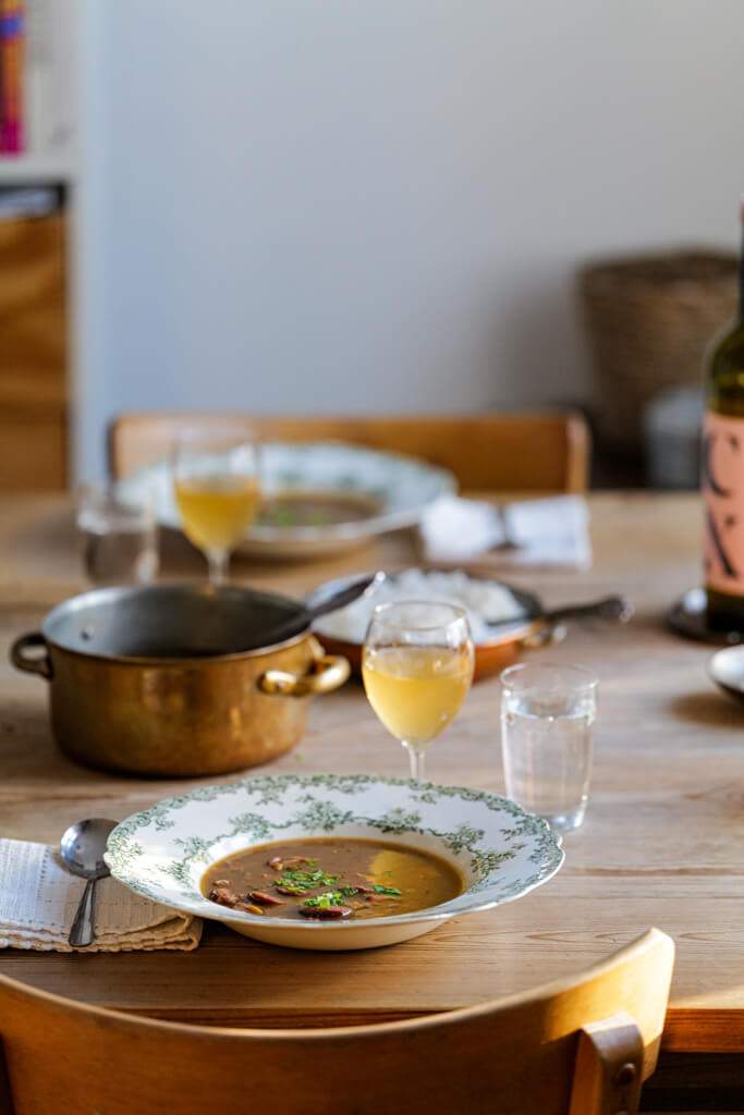 En veldig viktig ting jeg lærte av Chef Eric var å skumme av gumboen for overflødig fett før servering. «This is the nasty stuff», fortalte han, og han har rett. Det er fettet fra rouxen og overflødig fett fra pølsene. Det må bort for å få god smak på gumboen. Vi brukte også bladene fra stangsellerien som pynt ved servering.