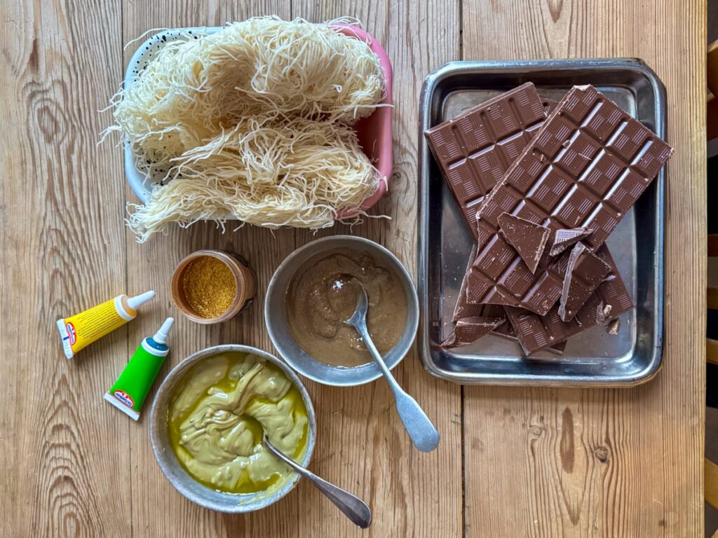 Kadayif er ikke lett å få tak i, så her må du gjøre litt reseach. Jeg var heldig og fikk tak i en pakke gjennom bekjente. Pistasjkrem fikk jeg i gave av Olivenlunden 1830 (reklame). Oliviers & Co har også, samt andre delikatessebutikker. Du kan selvsagt også lage denne kremen selv. Men jeg brukte ferdig krem. Og så trenger du tahini. Kjøp en med god kvalitet. Du trenger melkesjokolade, og her ville jeg også ha gått for noe med god kvalitet. Det lønner seg når du skal lage noe så eksklusivt.