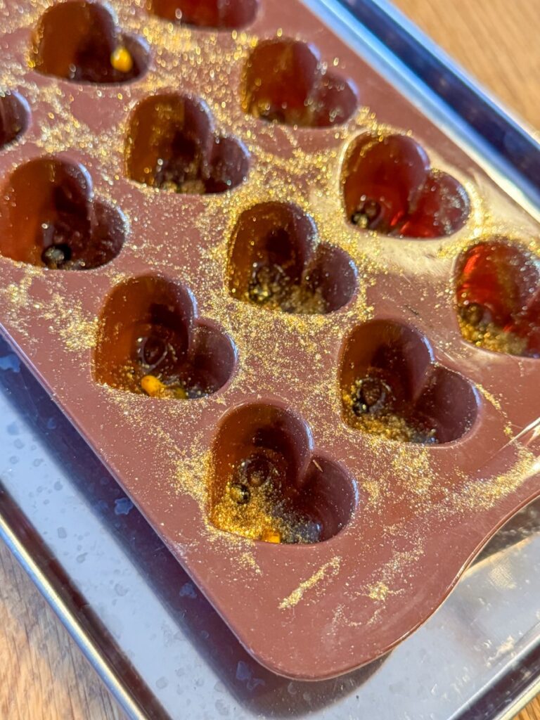 - Du kan drysse litt gull i formene sammen med en dråpe av konditorfargene for å få et "autentisk" Dubai-sjokoladepreg.