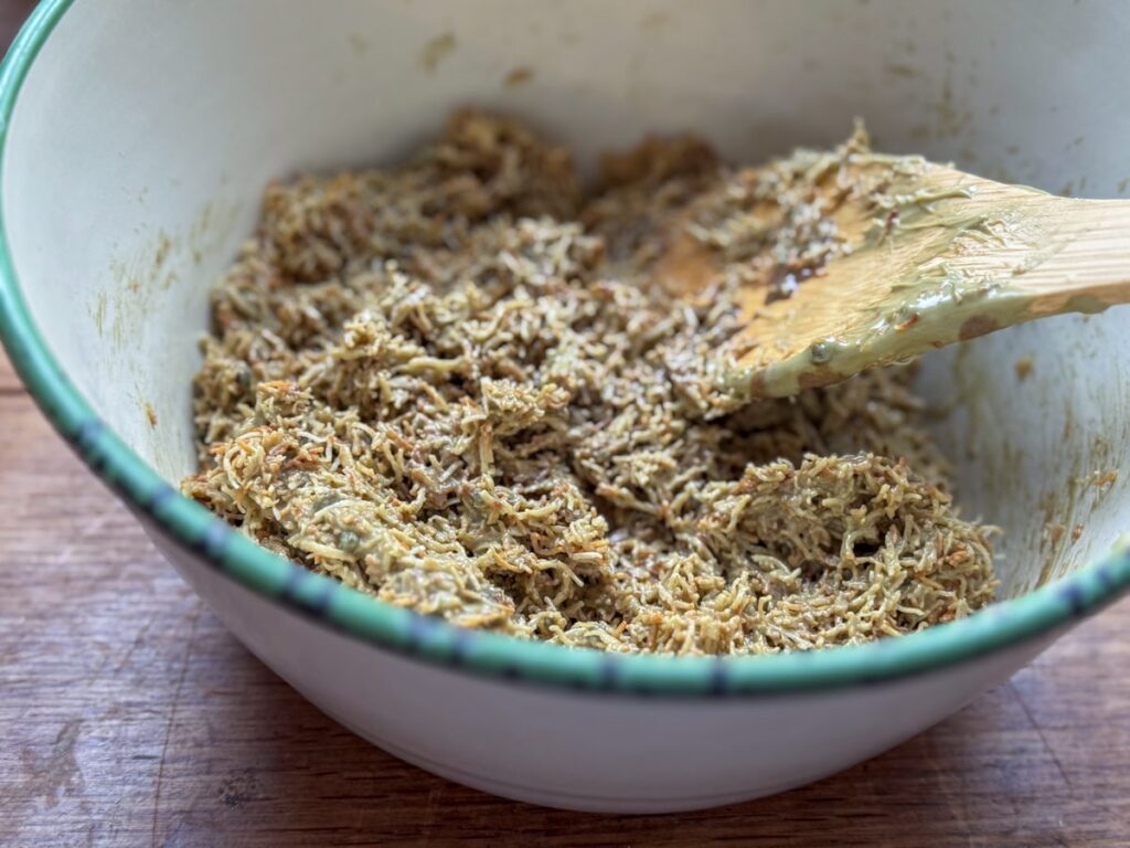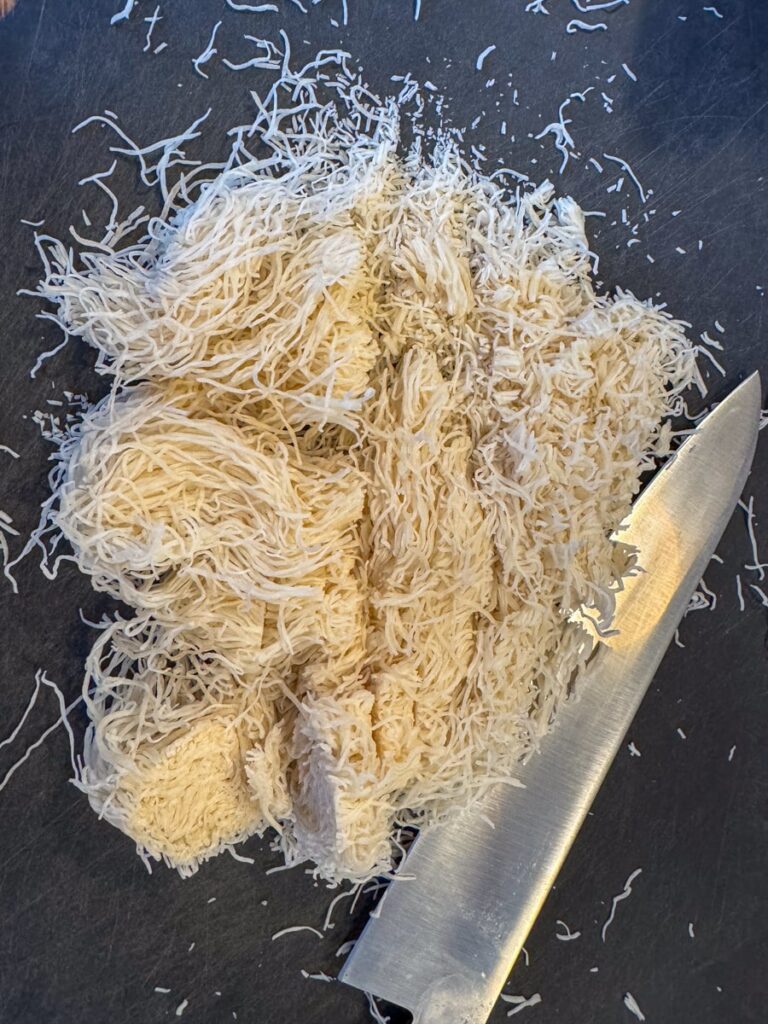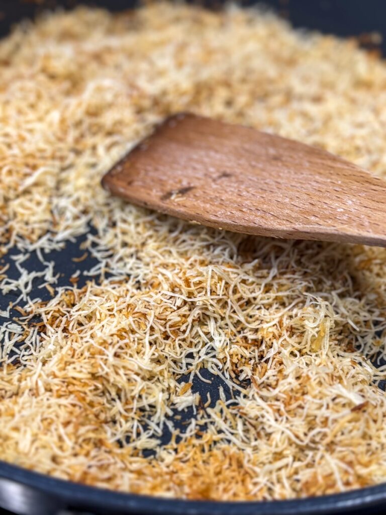 - Finhakk kadayif og stek i pannen med smør til den er sprø og gyllen. Den skal knase, så det er viktig at den er sprø.
