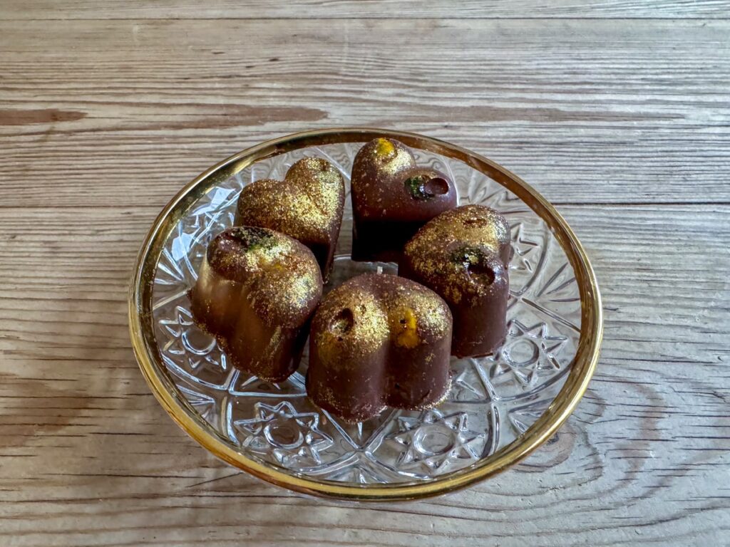 Det jeg har laget er Dubai-sjokolade i konfektform. Disse små hjerteformede sjokoladene har jeg valgt å kalle habibi-konfekt. Habibi betyr «min kjære» på arabisk og fordi dette er små hjerter laget meg kjærlighet, så synes jeg selv at navnet er passende. Jeg har gjort mange rare ting i livet mitt, og en av dem er å lære på arabisk på Friundervisningen for en god del år siden. Jeg har fullført første semester og det eneste jeg egentlig lærte var hvordan skrive alfabetet, uttale av bokstaver og småord som habibi og lignende. Nå skal det sies at det å lære alfabetet er en jobb i seg selv. Arabisk er drittøft å lære, og det ble med det ene semesteret.