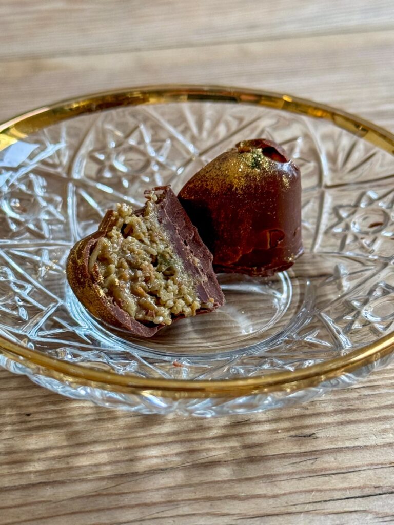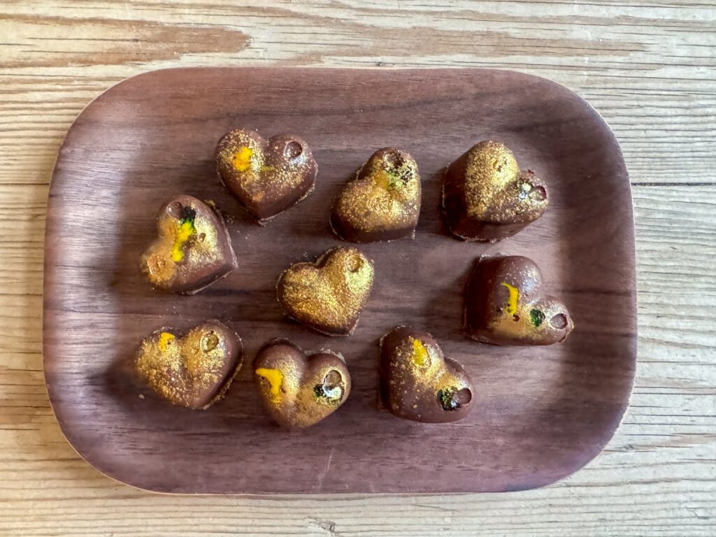 - Vend dette med pistasjkrem og tahini. Fyll formene og press sammen med en skje. Ha mer smeltet sjokolade på toppen og skrap av ujevnheter. Sett tilbake i fryseren til sjokoladen har satt seg. Ta ut sjokoladene fra formen og nyt! Jeg anbefaler å oppbevare dem i en lufttett boks i kjøleskapet, men ta dem gjerne ut noen minutter før de skal spises.