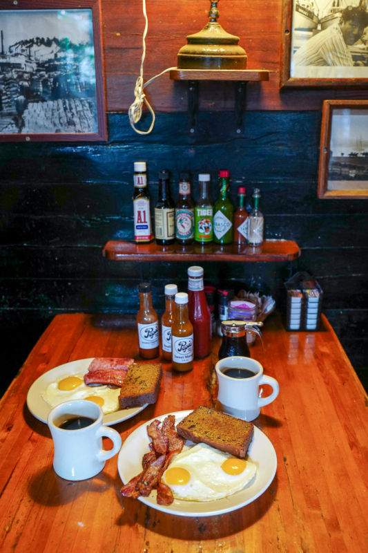 Vi spiste frokost her. Perfekt stekte egg, bacon og husets eget søte gresskarbrød med smør på. Kaffen kommer med korte intervaller og isvannet fylles opp. Det er godt å være på Pepe’s Café.