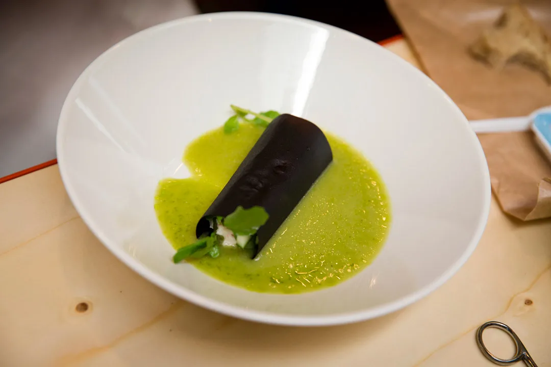 Forretten kommer på bordet. Dette er en kald, grønn tomatsuppe og en rull laget av malt, krabbe og røkt ostekrem. Det smaker nydelig og fresht.