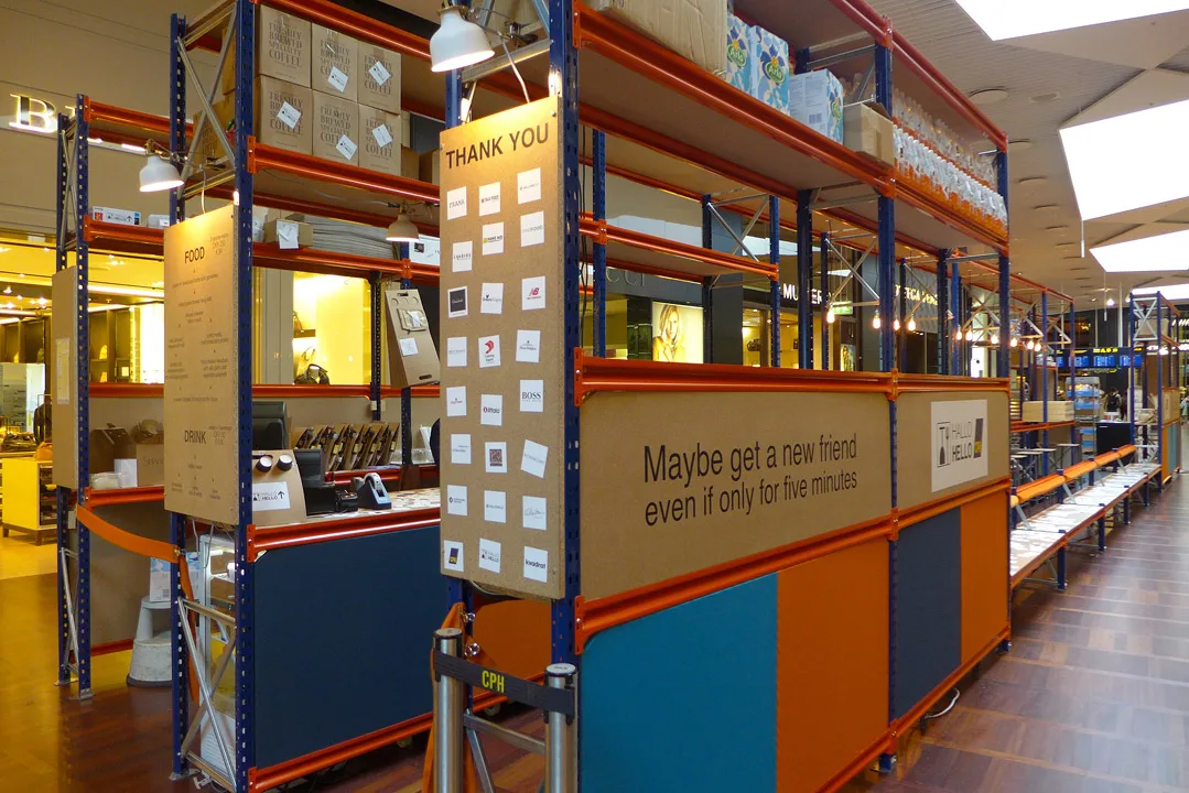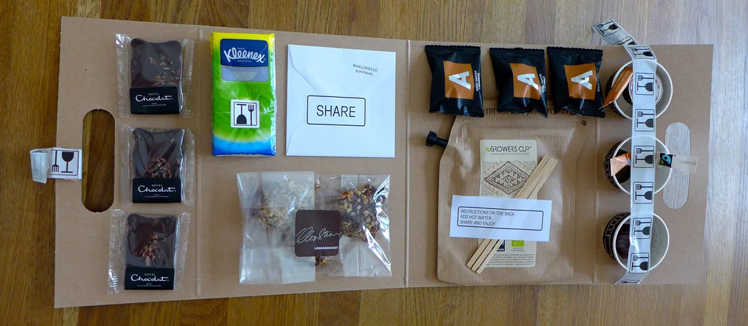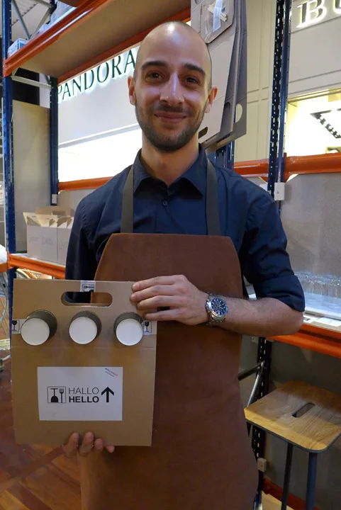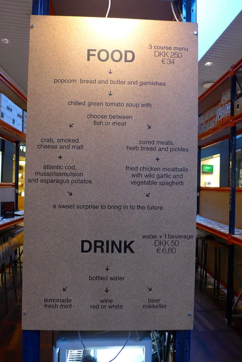 Konseptet er en del av Copenhagen Cooking og er en pop up-restaurant ved navn HALLO HELLO midt i «handlegaten» i avgangshallen på selveste Copenhagen Airport. Her kan du spise en tre-retter til 250 kr, samt det du vil drikke til 50 kr. Meningen er at du skal kunne møte fremmende mennesker og kanskje slå av en prat før du flyr hjemover. (Derfor «Hallo Hello»). Det er en fin tanke. Og hvis du kommer til å si noe flaut, er det jo bare å tenke «jeg flyr jo straks og jeg kommer aldri til å møte dette mennesket igjen». På den andre side kan det være du møter et menneske du vil komme til å ha kontakt med resten av livet.