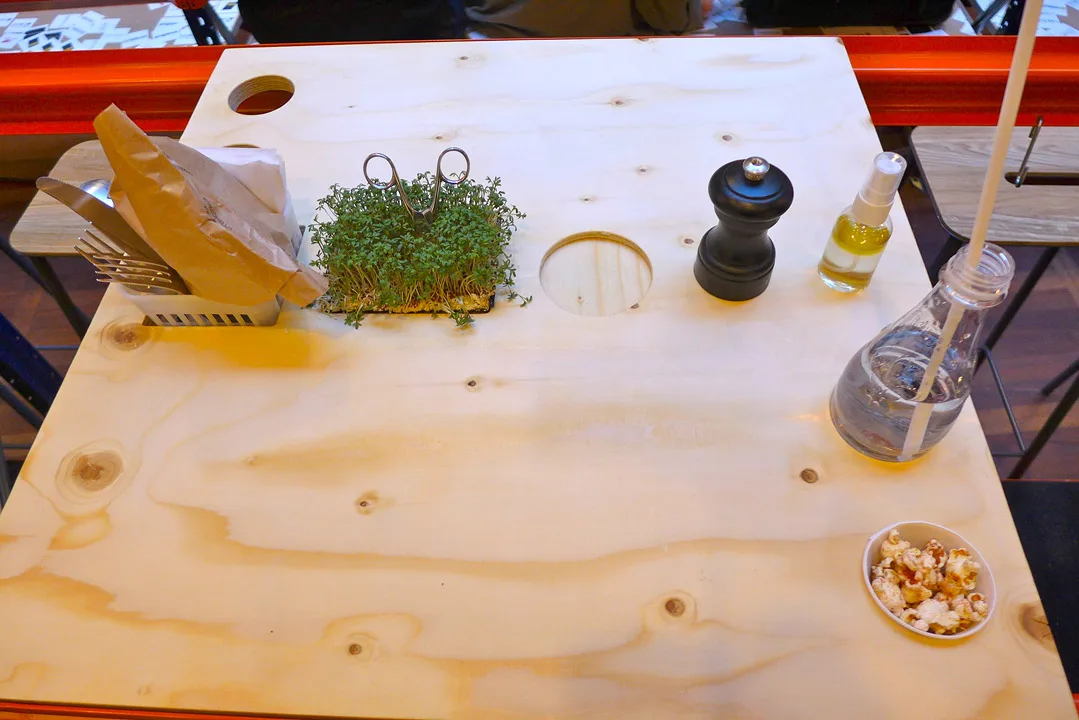 Jeg setter meg ned og bordet mitt bæres inn (Ja, du leste riktig). En bordplate med vannflaske, popcorn med tomat og eddik, pepper, karse med saks til å krydre maten, bestikk, deilig brød og smør.