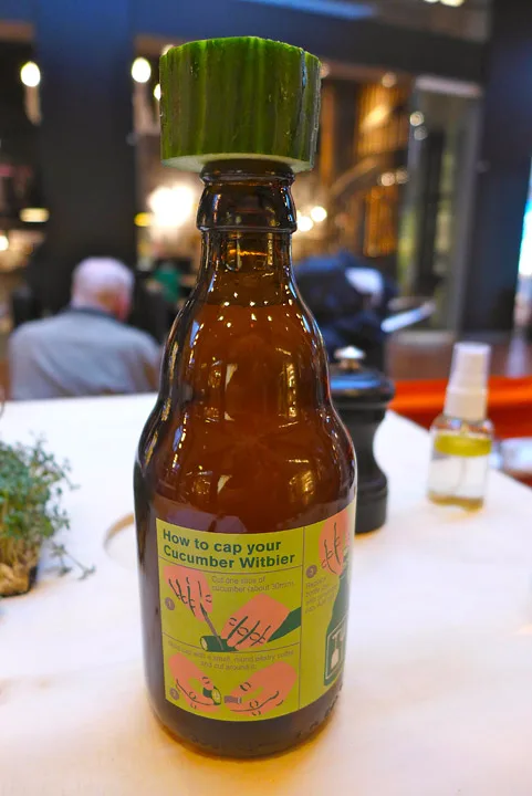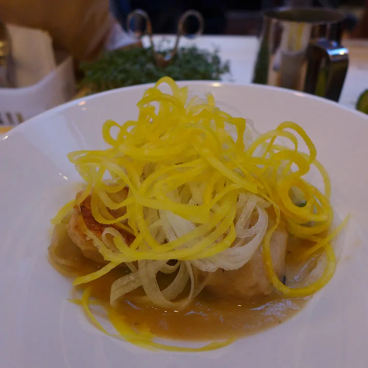 Jeg blir fortalt om utfordringene ved ikke å ha komfyr. Maten blir varmebahandlet på forhånd og så lagt i vakumposer og varmet opp. Sous Vide eller Fjordland, hvis du skjønner. Det fungerer utmerket. Du glemmer helt at du sitter på utstilling i en spartansk-utseende, midlertidig restaurant. Dette opplegget er både morsomt, godt og overraskende. Men det er ikke så lett å få øye på restauranten, selv om du praktisk talt snubler i den. Jeg tror flere hadde fått nyte denne opplevelsen hvis man fikk en flyer i hånden etter at man kommer ut av sikkerhetskontrollen.