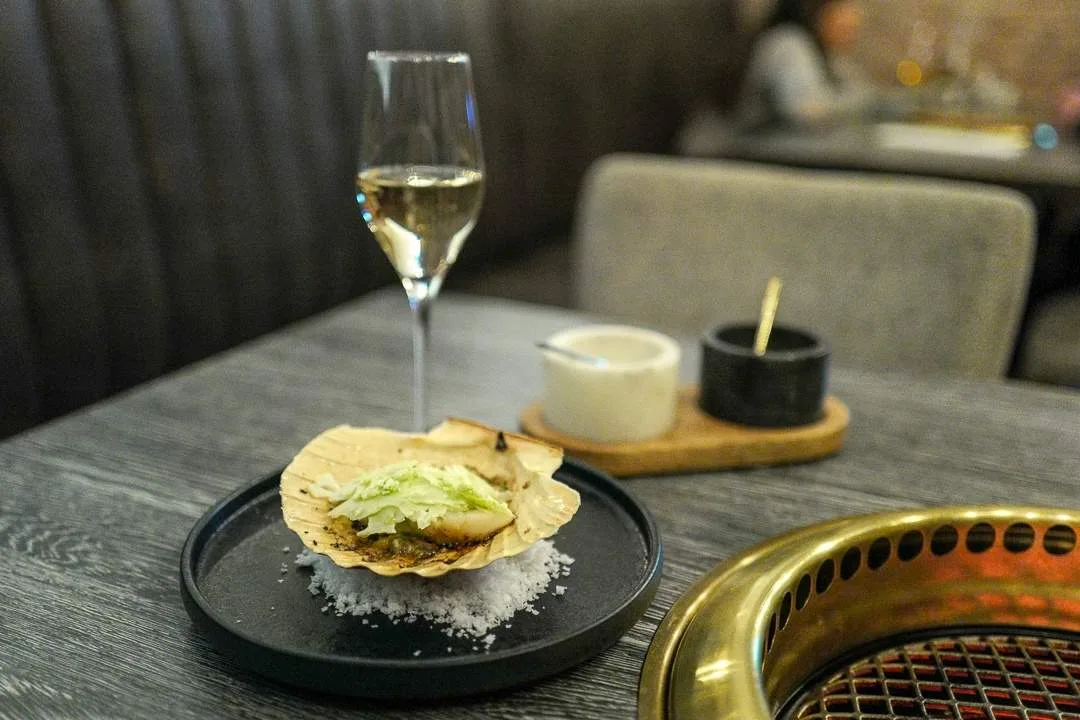 Når kamskellet er perfekt stekt legger du kålsalaten over i skjellet. En perfekt kombinasjon av syren fra kålsalaten og det kraftige (men akk, så deilige) beinmargssmøret. Nydelig til husets egen champagne.