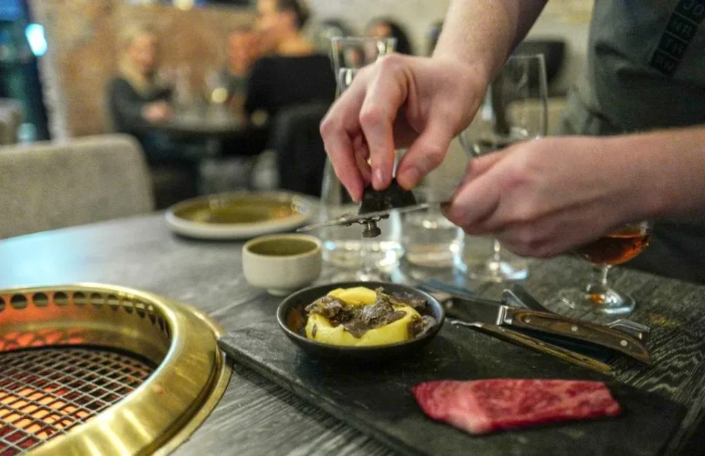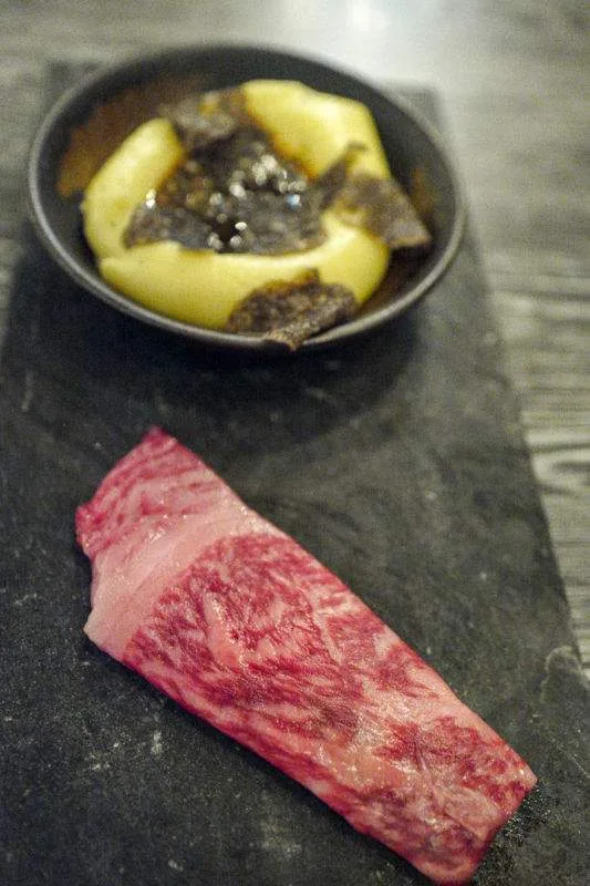 Og nå må jeg holde meg fast i bordkanten. For inn kommer et lite stykke perfekt marmorert wagyu og en skål med en potetmos som må inneholde vel så mye smør som poteter. Og det er det absolutt ingenting i veien med. Tvert imot. Men det stopper ikke der. Kjøkkensjef Odd Ivar Jørgensen høvler sort trøffel over potepuréen som også har en liten dam av konsentrert saus i midten.