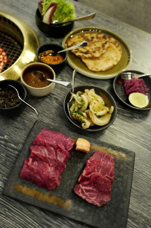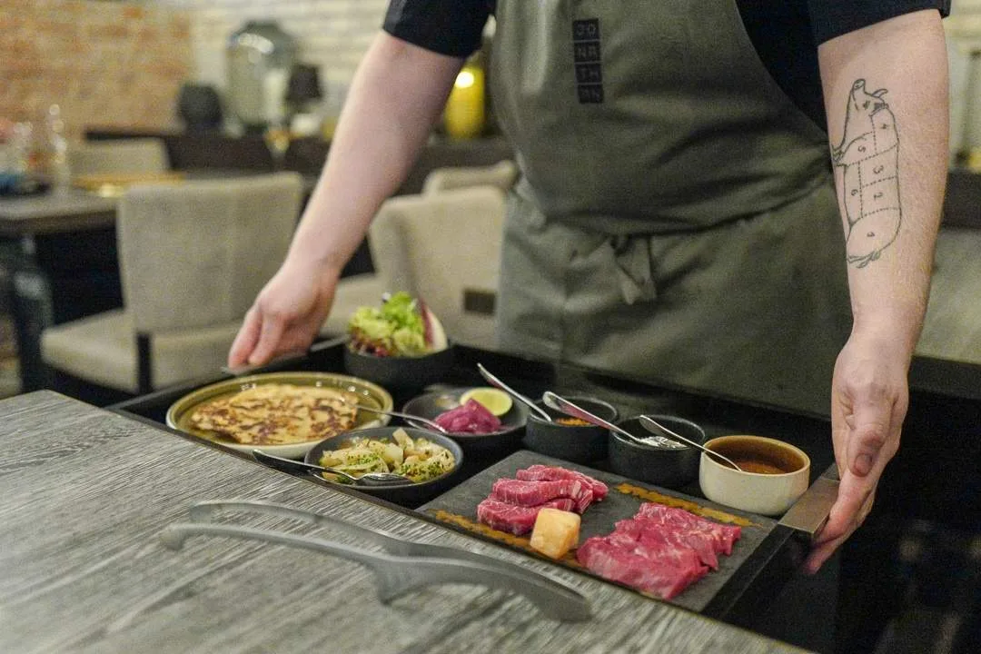 Jeg får en av de helt nye rettene inn på bordet. Grillen er tent og avtrekksviften som ligger inne i selve bordet sørger for at stekosen forsvinner uten å gå ut i rommet.