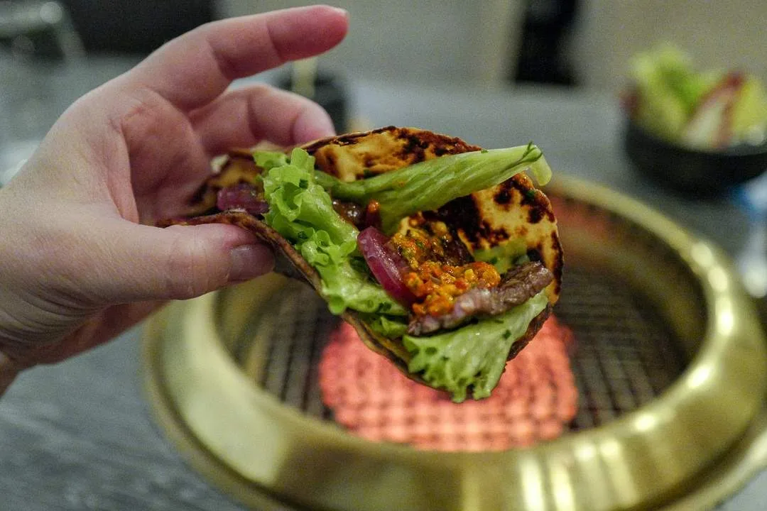 Jeg griller potetpannekakene for å mykne konsistensen og fyller en av dem med salat, kjøtt, løk og de fantastiske sausene: Romesco laget på rugbrød (smaker dønn lik den jeg lager og da vet du den er god. Ha ha ha!), mole (meksikansk saus som kan lages av over tjue ingredienser som chili og sjokolade) og salsa macha (peanøtt- og chilisaus som smaker helt magisk). Det er jo ikke en taco, dette her for det er ingredienser fra alle veikryss i verden. Men det er tacofølelsen du får når du bygger din egen rett. Når det er sagt er det en sjelden god rett de har på menyen. Nei, forresten, den er jo ikke på menyen. Sant, det. Men den kan bestilles i alle fall, og det skal du jaggu gjøre, for dette er kos. En fantastisk måte å spise på. Sosialt og spennende. Litt som 70-tallsklassikeren fondue. Og retro er vi jo glade i.