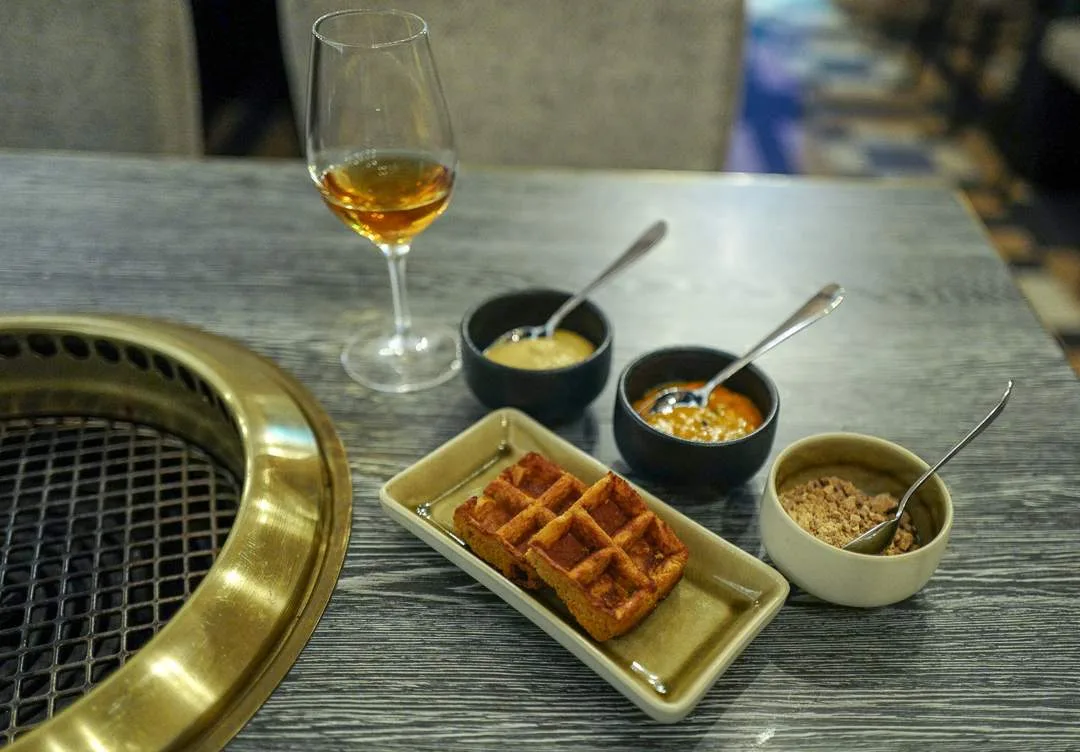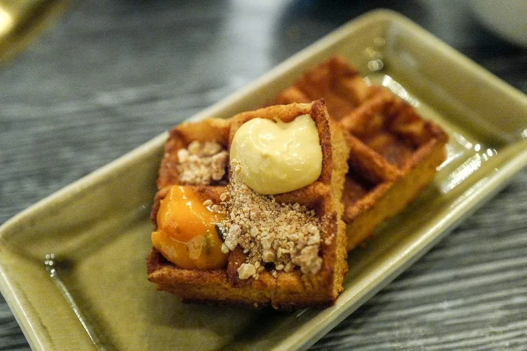 Desserten jeg får servert er nok en innertier. Vaffel med brunost og tindvedmarmelade, Tindvedkrem og karamellisert hvit sjokolade er den perfekte lille søtt/syrlig-opplevelsen som renser munnen etter et deilig grillmåltid.
