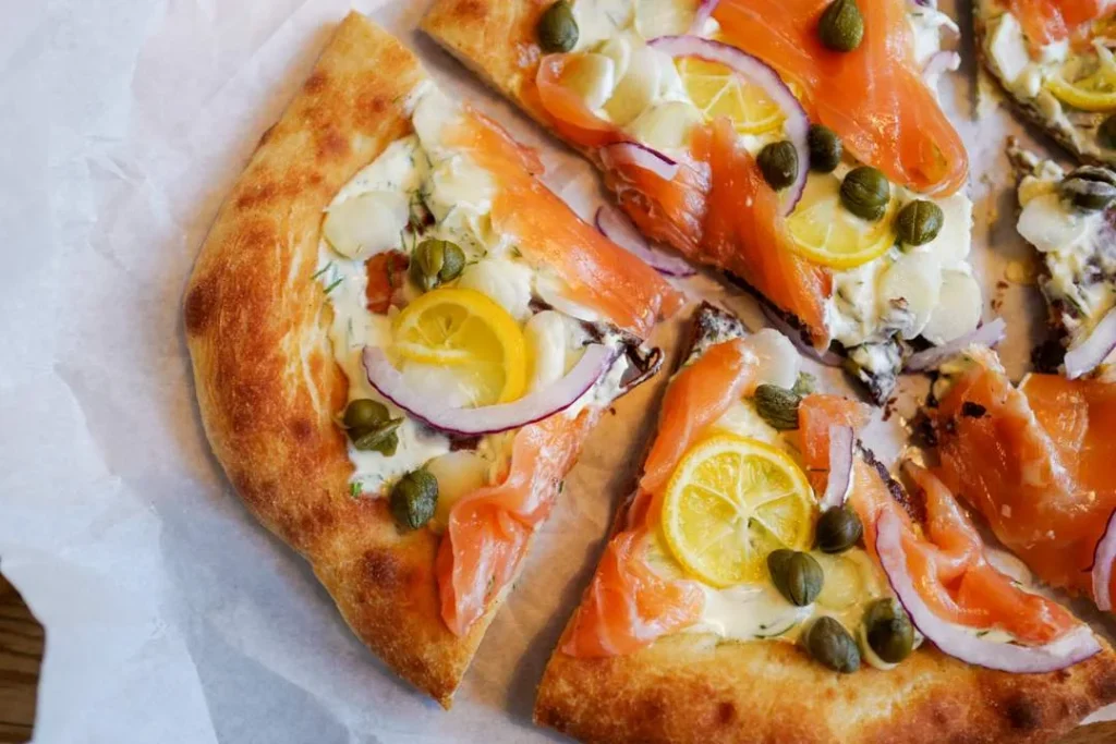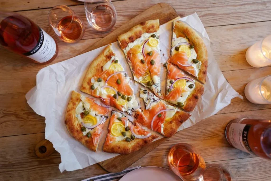 Lag en saus av 1 dl Røros Rømme (det er jo den beste), hakket dill, litt revet sitronskall, bittelitt dijonsennep, salt og pepper. Spre utover når pizzaen er lunket. Legg på skiver av god røkelaks, rødløksskiver, kapers og sitronskiver (jeg bruker fancy minisitroner der du kan spise skallet) Server og drikk vin til. Gjerne rosevin.