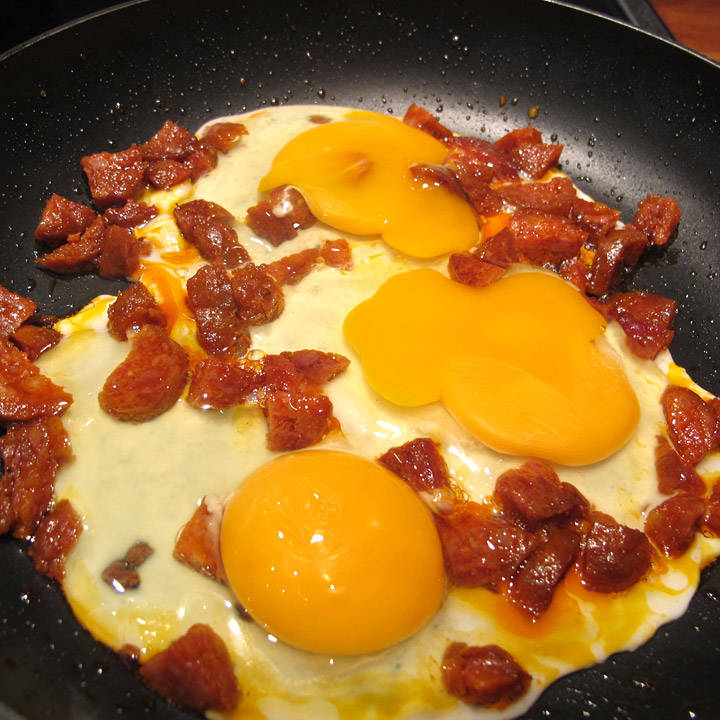 Skjær pølsen i skiver (ta av skinnet) og stek i en varm panne. Ta vare på oljen, men legg pølsebitene på et fat. Har du poteter fra gårsdagens middag, skjærer du dem i biter og steker dem sprø i den herlige chorizo-oljen.
