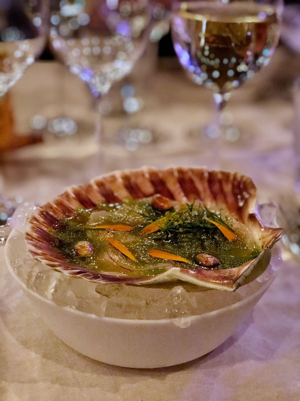 Rett nummer to blir servert på en skål med is. Kamskjell med eple-aguachile. Den serveres med korianderolje, jalapeno-salt, stekt mais for krønsj og ringblomst. Retten er forfriskende og skjønn. De norske kamskjellene er delikat skåret i tynne skiver.