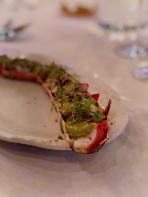 Paco kommer inn med store kongekrabbebein. De serveres med pipian-saus. Dette er en saus laget av gresskarkjerner – også kjent som grønn mole. På toppen er det pyntet med sesamfrø, gresskarkjerner, frisk korianderfrø og tomatillo.