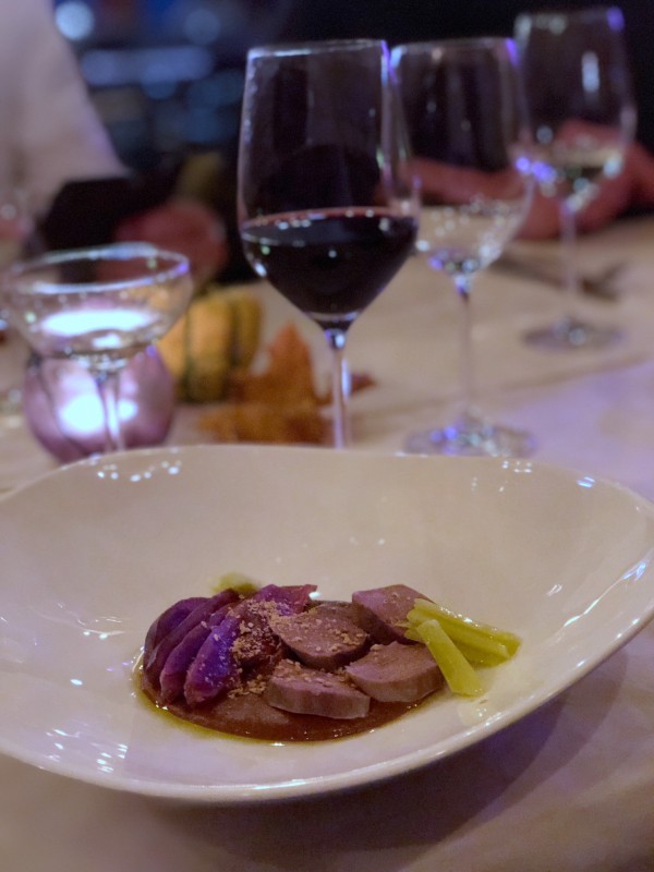 Første rett ut er blåskjell i salsa vuelte a la vida – en herlig kald kraft laget av hvitvin, spisskummen, tomatsaus og syltet jalapeno-emulsion. Vi plukker og slafser og er superglad for tøyservietten vi har fått. Grisete og godt.