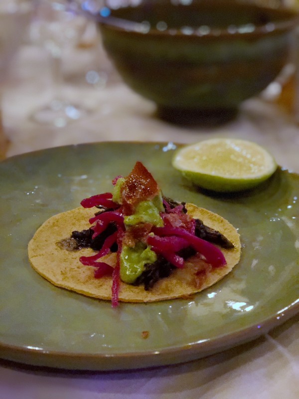 Pattegrisen brukes til de beste tacoene du kan tenke deg. Cochinita med recado negro bønnesaus. Paco har med tortilla fra restaurantene sine i Barcelona og ifølge ekspertene rundt bordet, er de av den aller beste kvalitet.