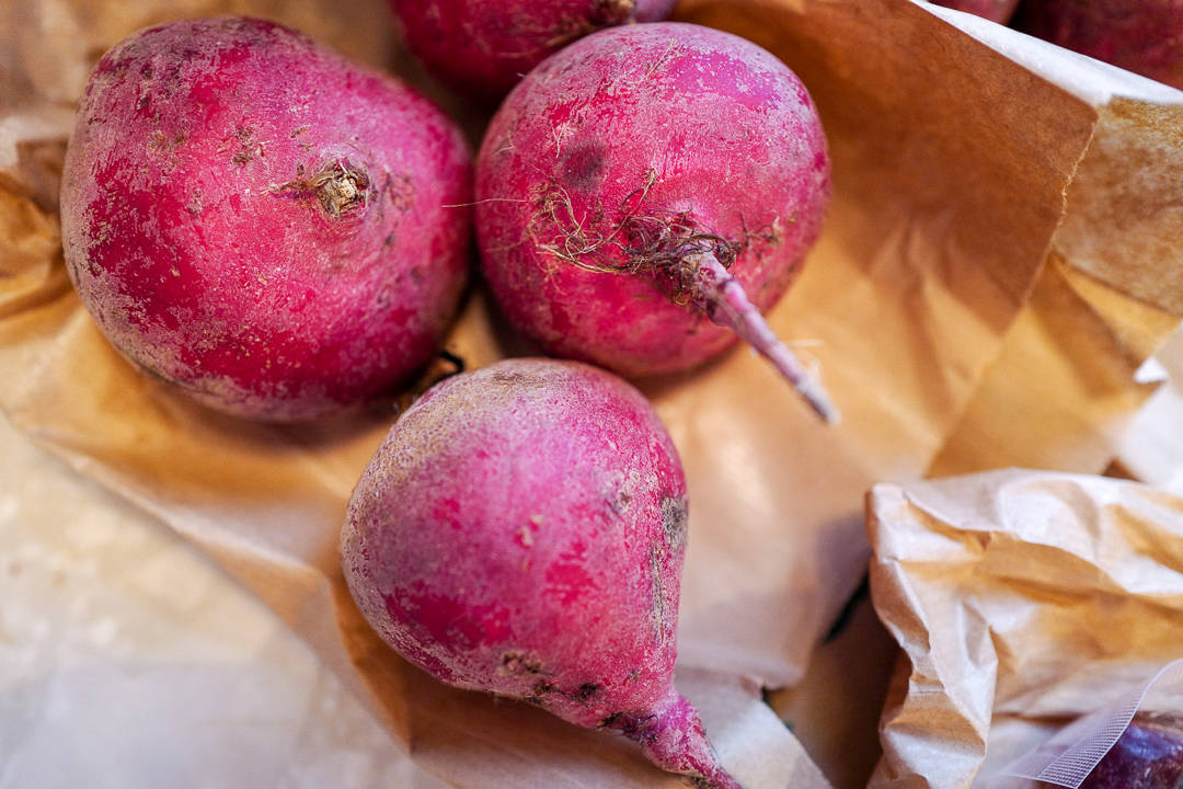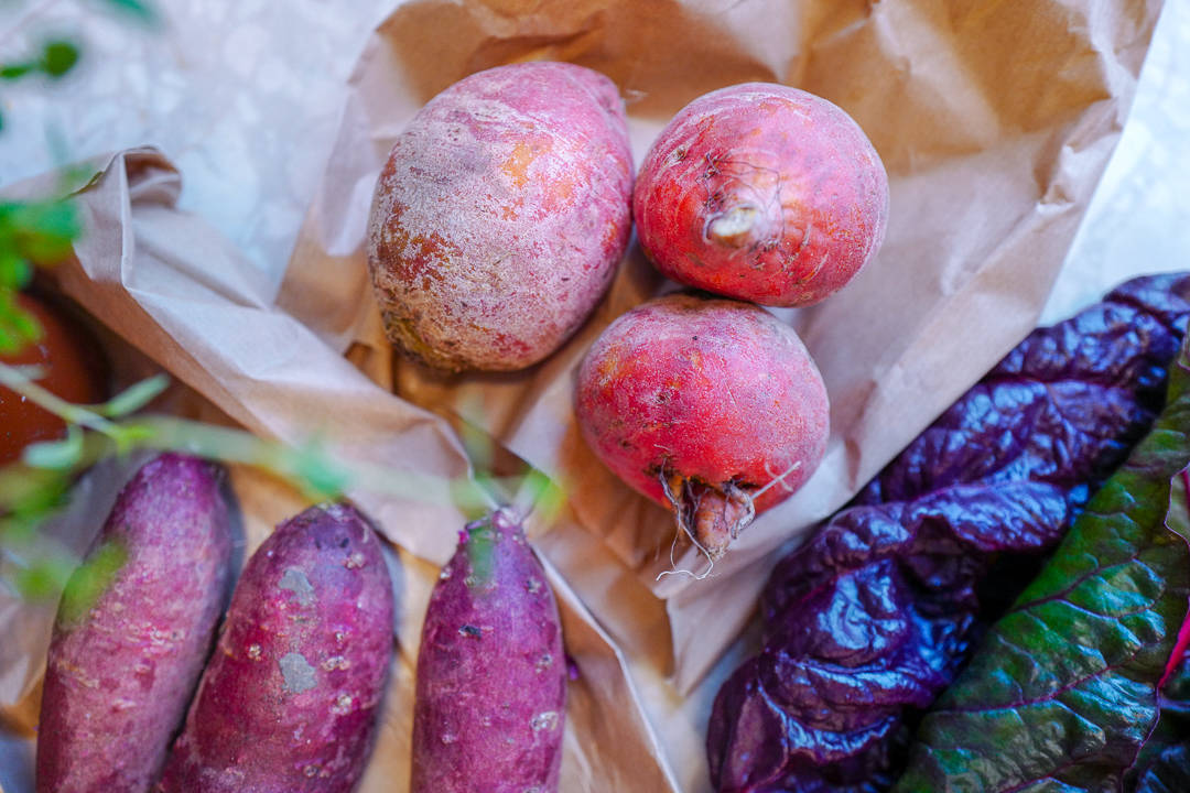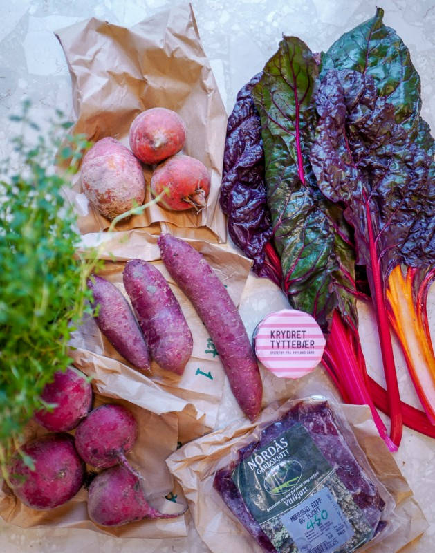 Andre varer jeg legger i handlekurven er fargerik, økologisk mangold fra Korsvold Gård, Økologisk polkabeter og gulbeter fra Rosnes Gård. Mangold er det samme som bladbete og den kan wokes eller dampes. Jeg skal smørdampe den i pannen med litt hvitløk, salt og frisk timian. Betene bruker jeg på to forskjellige måter.