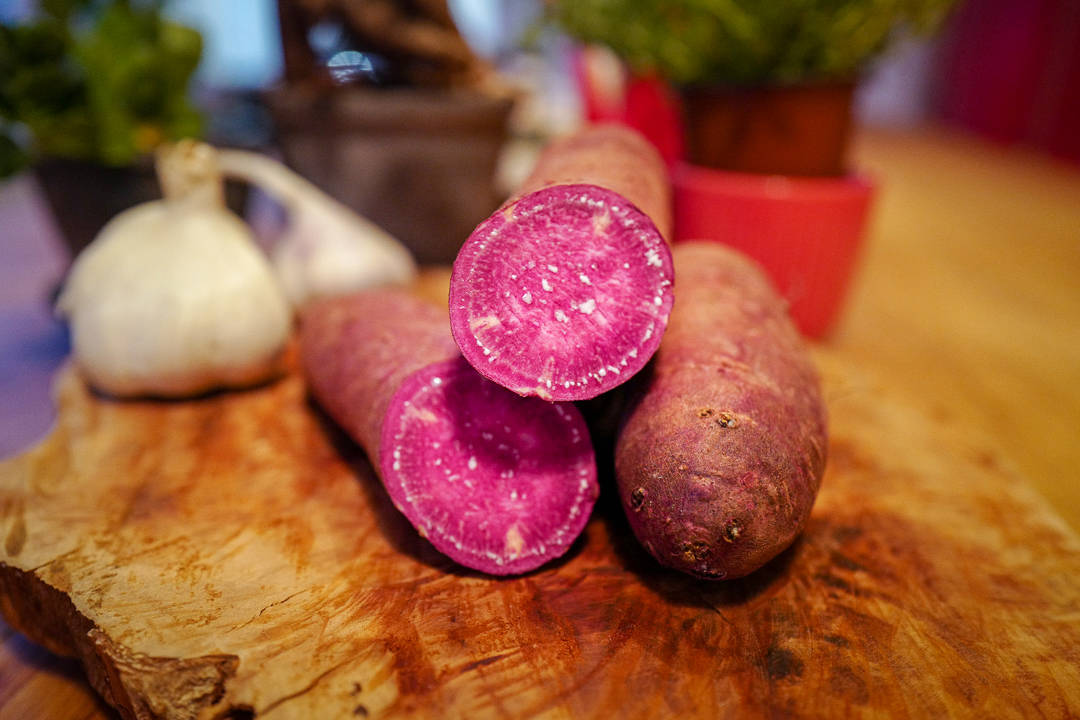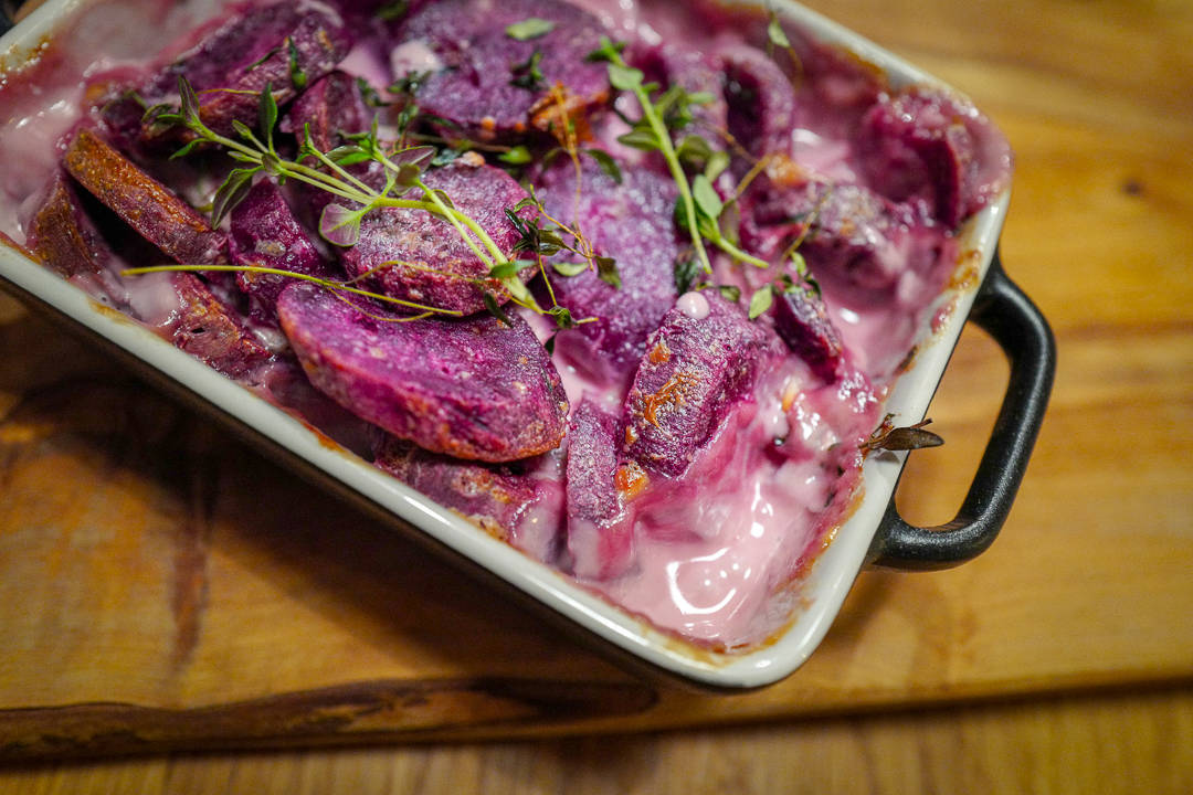 Etter en uke i solfylte Hellas med middelhavsmat venter en regntung helg i Oslo. Det må jeg gjøre det beste ut av. Derfor står det vilt på menyen. Utvalget av vilt på Dyrket.no er formidabelt. Jeg går for mørbrad av norsk villhjort fra Nordås Gårdskjøtt. Til dette lar jeg meg friste av lilla søtpoteter fra Grønt & Godt. Lilla søtpoteter har jeg bare sett på Hawaii tidligere. Der heter de Ube og brukes til f.eks pannekaker. Det ser helt vilt ut for fargen er skikkelig lilla. Det er også disse søtpotetene. De er fiberrike og har et lavt kalori- og fettinnhold, så da tenker jeg at jeg bruker ekte fløte til å gratinere dem, jeg.