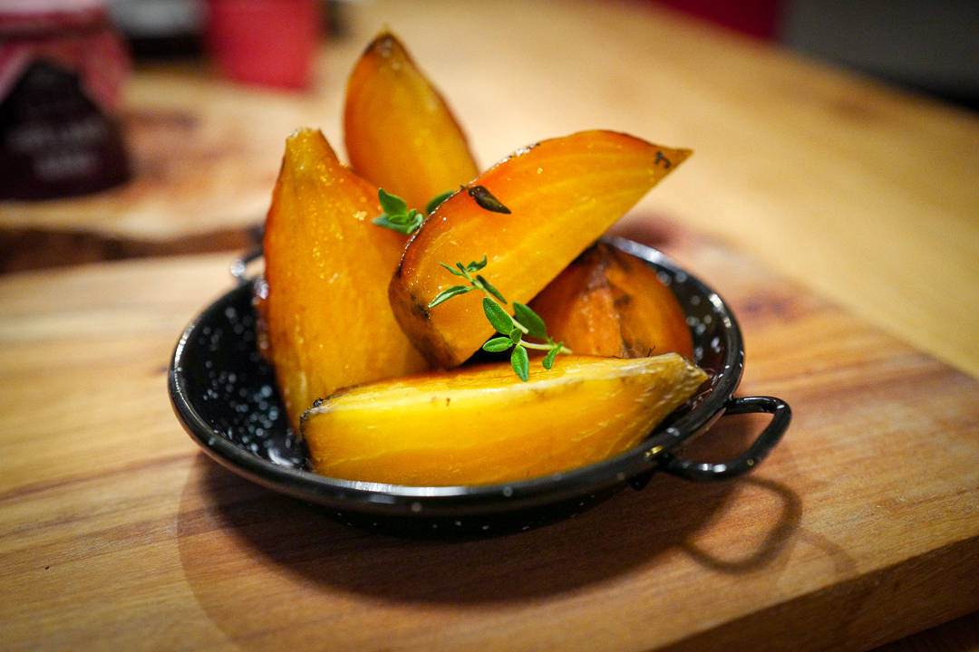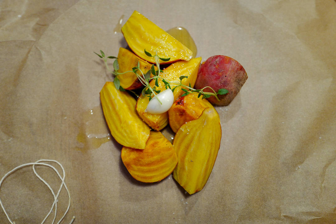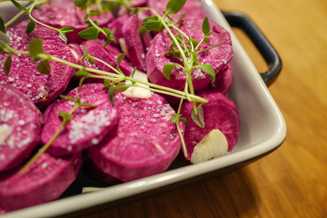 Gulbetene baker jeg i ovnen med hvitløk, salt, olivenolje og timian. Polkabetene er som sukkertøy og de skjærer jeg så tynt jeg klarer med en mandolin eller en ostehøvel/potetskreller. De kan man lynsylte eller brukes slik de er. Er skivene for tykke vil polkabetene ha for mye bitterhet i seg, så vær oppmerksom på det.