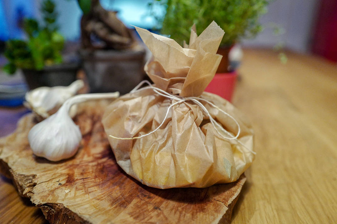 - Gulbetene: Vask dem og skjær av stilken. Del dem i fire båter og legg dem på et bakepapir. Hell over et par ss god olivenolje og dryss over litt flaksalt. Legg et hvitløksfedd og et par kvister timian på betene. Brett opp sidene på bakepapiret til en pose. Bind hyssing rundt og lukk. Sett i forvarmet ovn på 200 grader i ca 40 minutter.