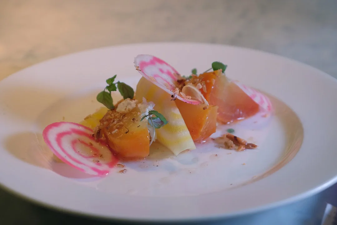 Forrett: Bakte gulbeter, chevreskum, ristede valnøtter og honning.
