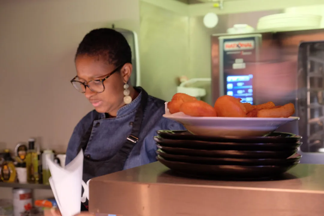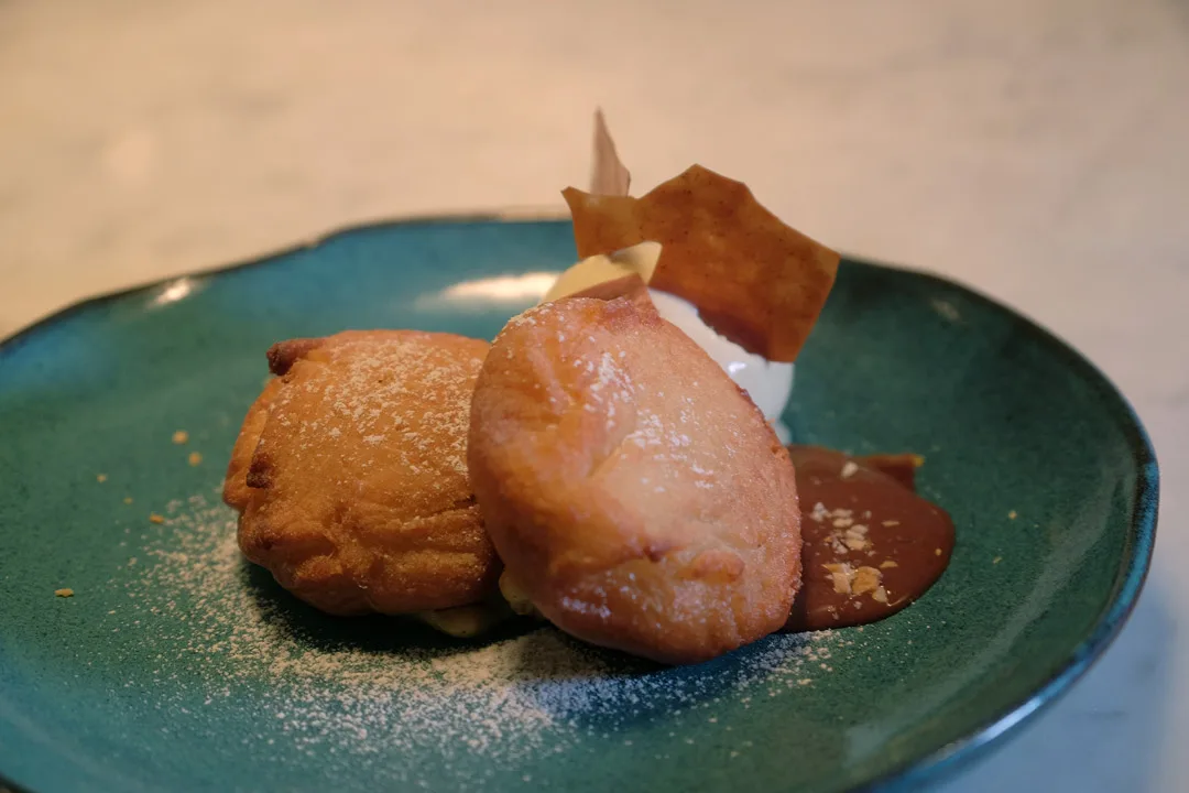 Dessert: Beignets chocolat-praliné med vaniljeis.