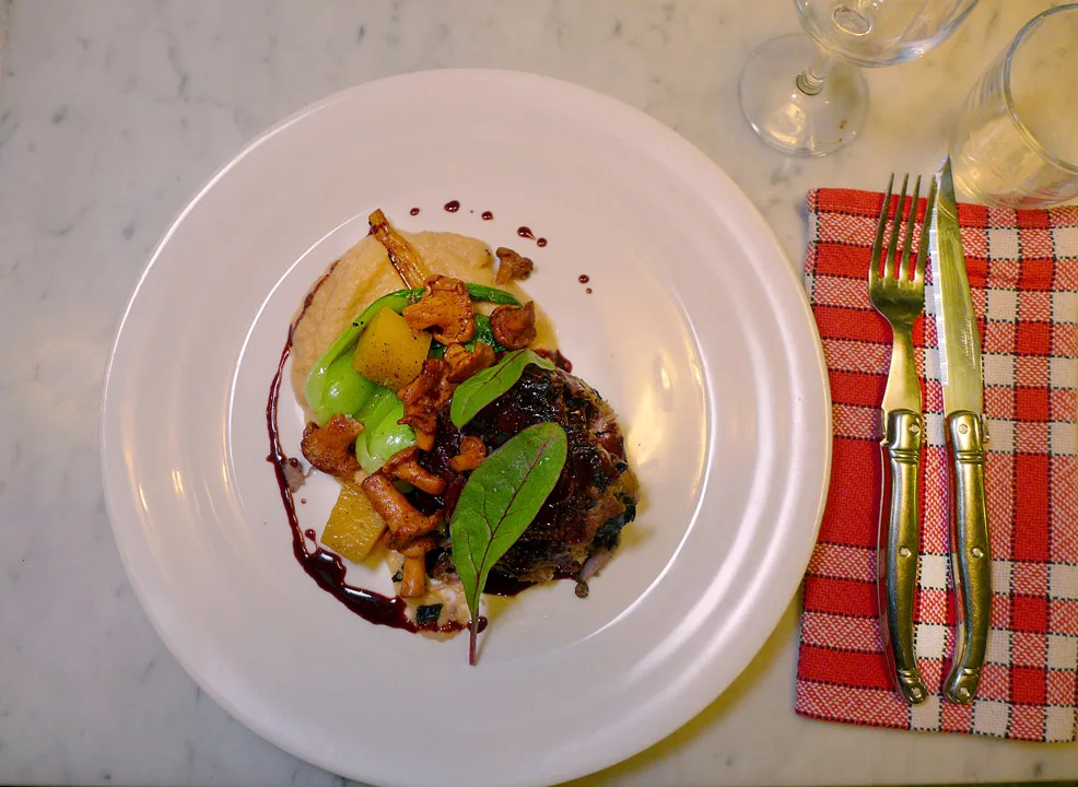 Hovedrett: Stekte andeconfit, kålrotpure, pak choi, persillerot og andesjy