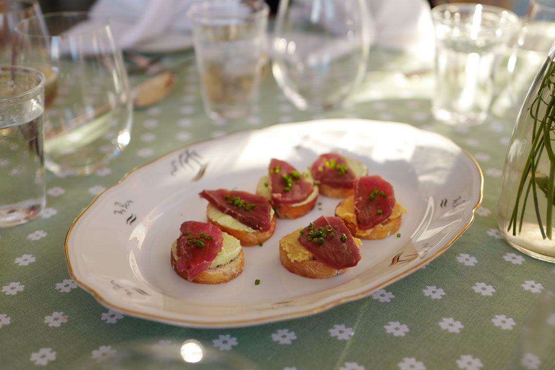 Calle snakker og serverer. Inn kommer et fat med minitoast med ramsløkskrem og lufttørket svinefilet. Sinatra synger over anlegget. Det knitrer i vinyl. Stemningen er på topp og vi er sultne etter å ha vært på ville grusveier – festkledd og noen i høye hæler.
