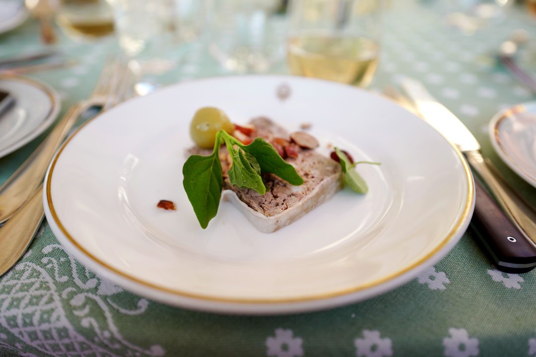 Forretten blir servert. Vi får en vidunderlig landpaté av lam med syltede grønne tomater, ristede mandler og marmelade av grønne tomater. Det er hjemmelaget. Til denne retten får vi en deilig Riesling Spätlese Trocken Mittelheimer Edelmann. Dette er Calles egen vin.