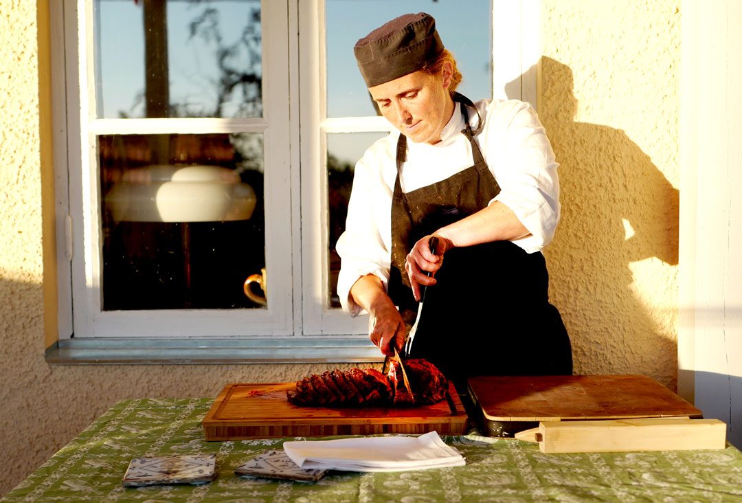 Hovedretten starter med at Anna kommer inn med en helstekt svinenakke gnidd inn med paprikapulver og sennep. Hun skjærer tykke, gode stykker av steika før Calle bærer brettet rundt og serverer ved bordene.